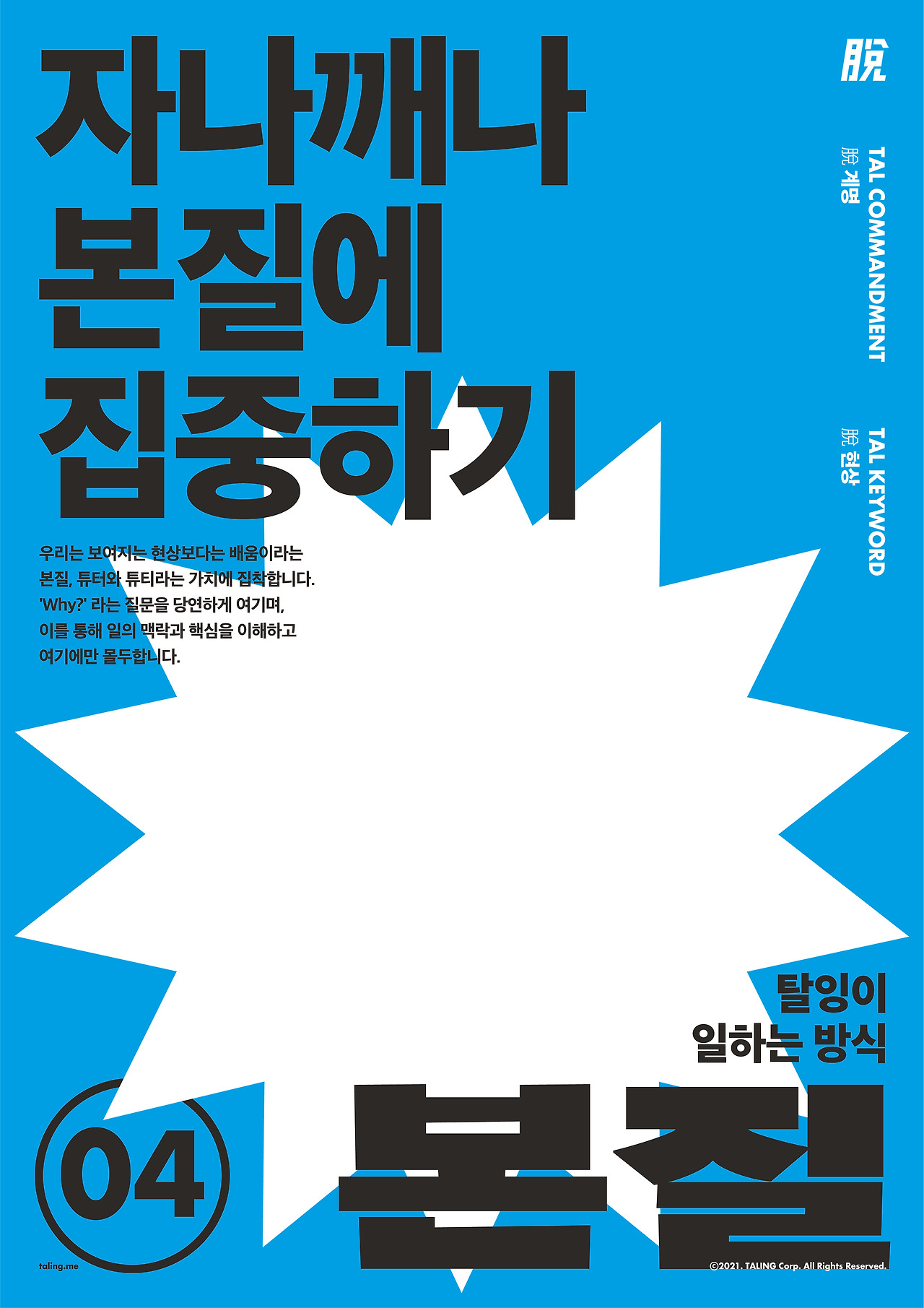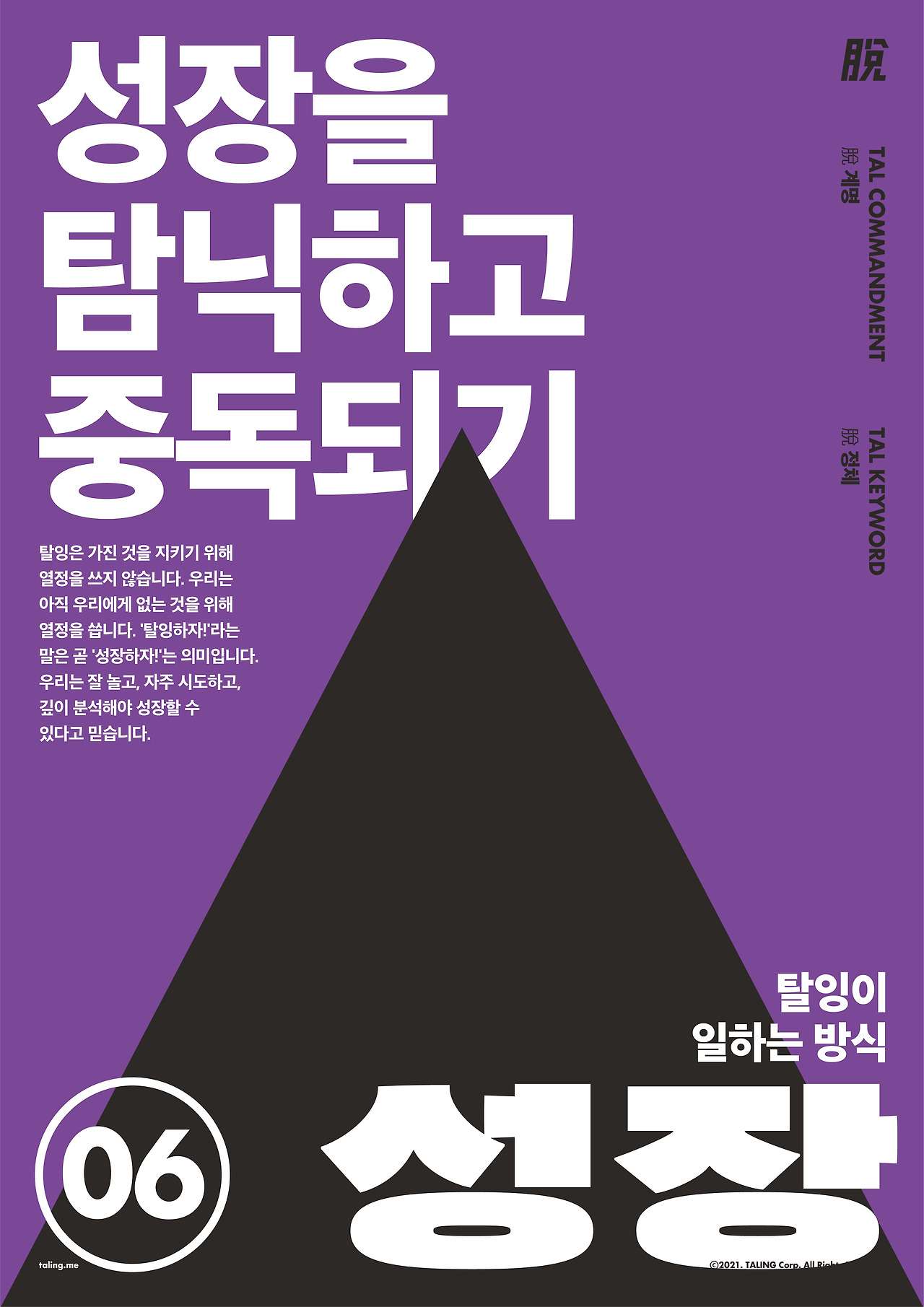 탈잉은 가진 것을 지키기 위해 열정을 쓰지 않습니다. 우리는 아직 우리에게 없는 것을 위해 열정을 씁니다. '탈잉하자!'라는 말은 곧 '성장하자!'는 의미입니다. 우리는 잘 놀고, 자주 시도하고, 깊이 분석해야 성장할 수 있다고 믿습니다.