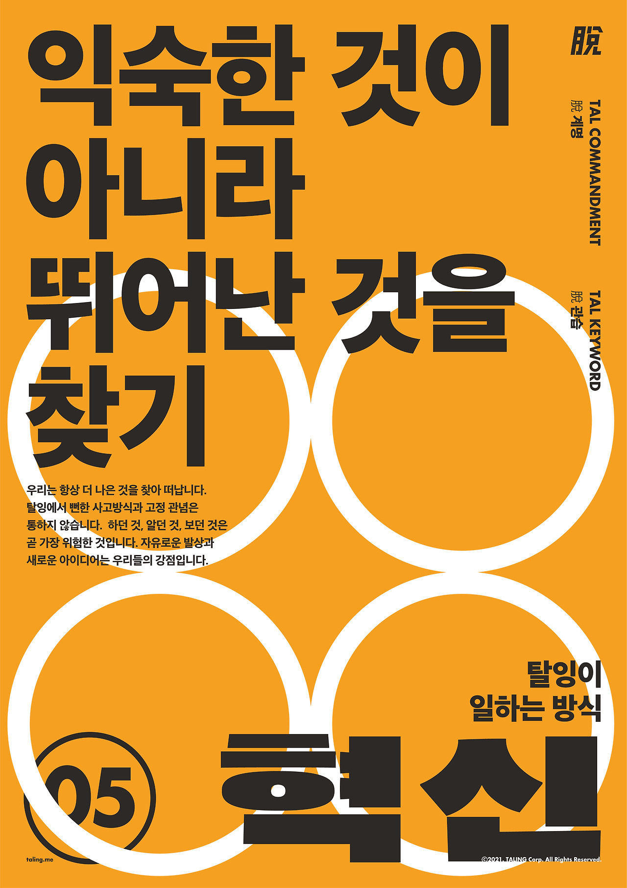 우리는 항상 더 나은 것을 찾아 떠납니다. 탈잉에서 뻔한 사고방식과 고정 관념은 통하지 않습니다. 하던 것, 알던 것, 보던 것은 곧 가장 위험한 것입니다. 자유로운 발상과 새로운 아이디어는 우리들의 강점입니다.