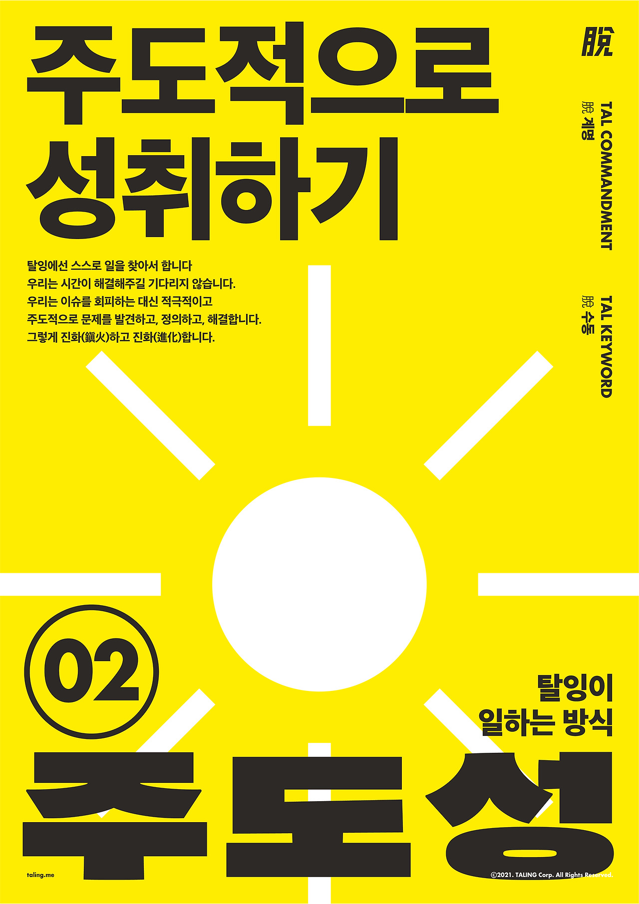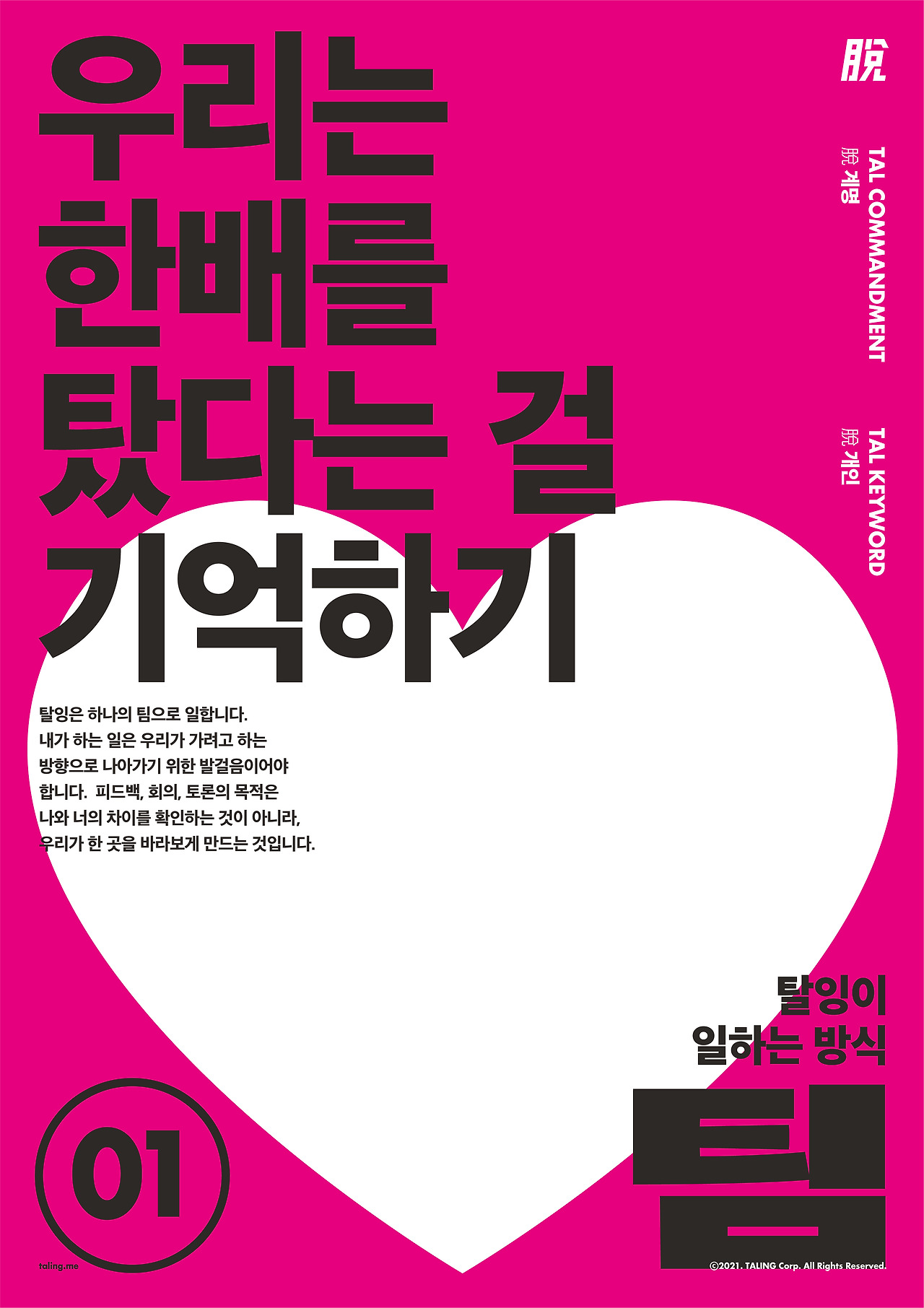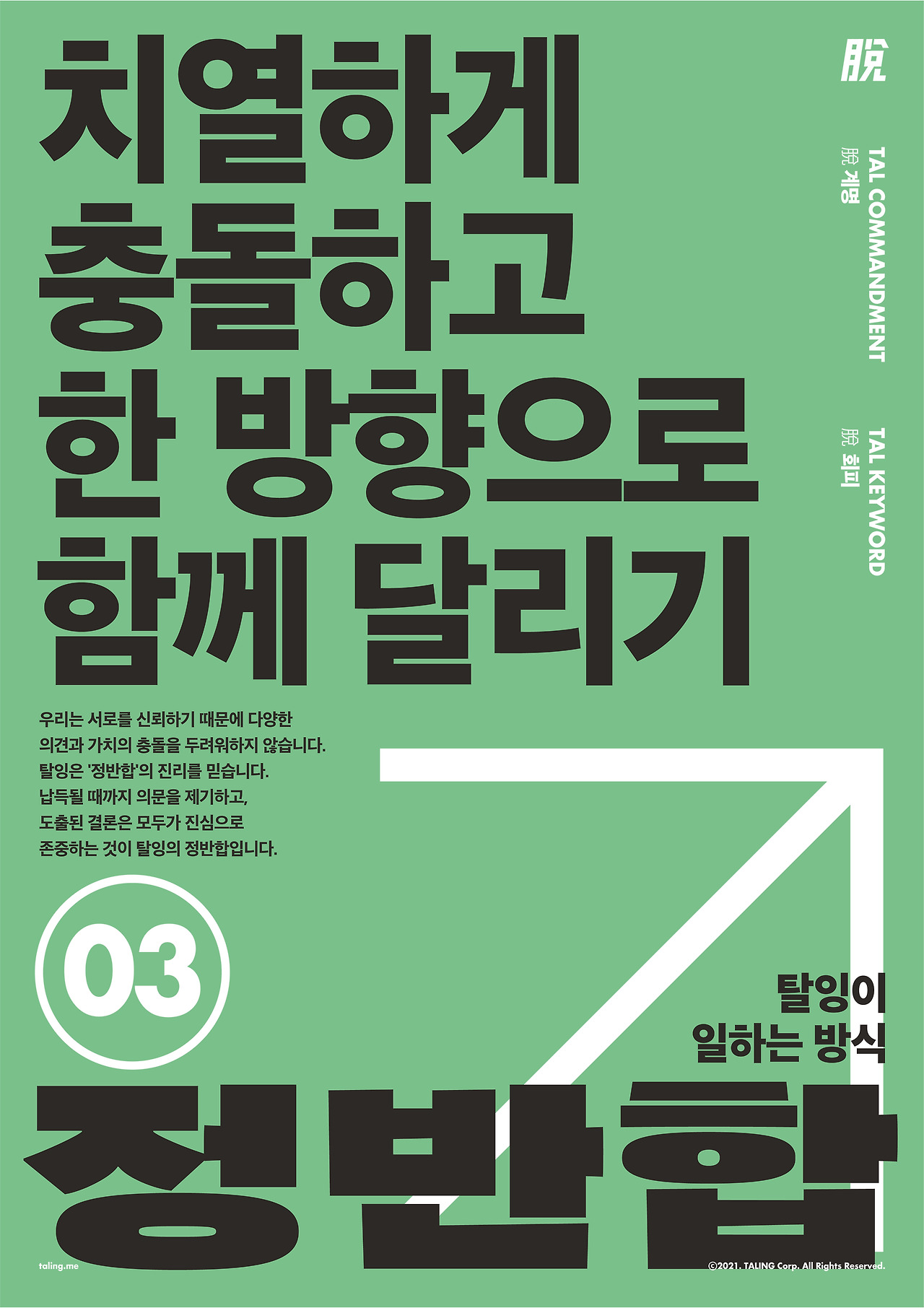 우리는 서로를 신뢰하기 때문에 다양한 의견과 가치의 충돌을 두려워하지 않습니다. 탈잉은 '정반합'의 진리를 믿습니다. 납득될 때까지 의문을 제기하고, 도출된 결론은 모두가 진심으로 존중하는 것이 탈잉의 정반합입니다.