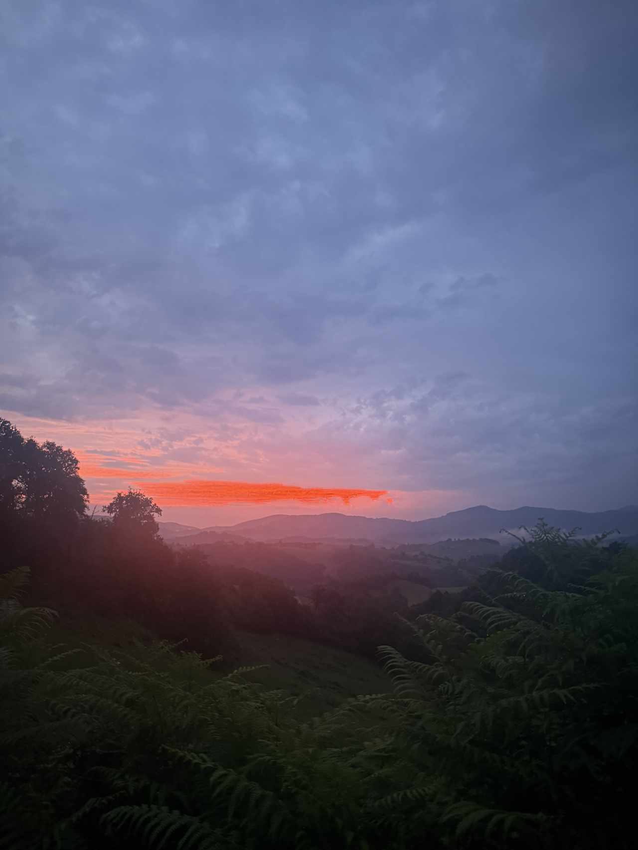 나름의 계획이 있었다. 피레네 산맥을 지나며 밝은 옷을 입고 사진을 찍고 싶었다. 푸른 들판에는 밝은 색의 옷이 잘 나오기 마련이니까. 그러나 내가 다시 입은 옷은 검은색 바지에 물 빠진 민트색 상의. 더군다나 비가 오면서 우비를 입고이동해야 했는데 우비색은 회색이었다. 망했다. 그래도 어쩌랴. 걷기 시작했다. 와중에 처음 맛보는 피레네산맥의 일출은 참 예뻤다.