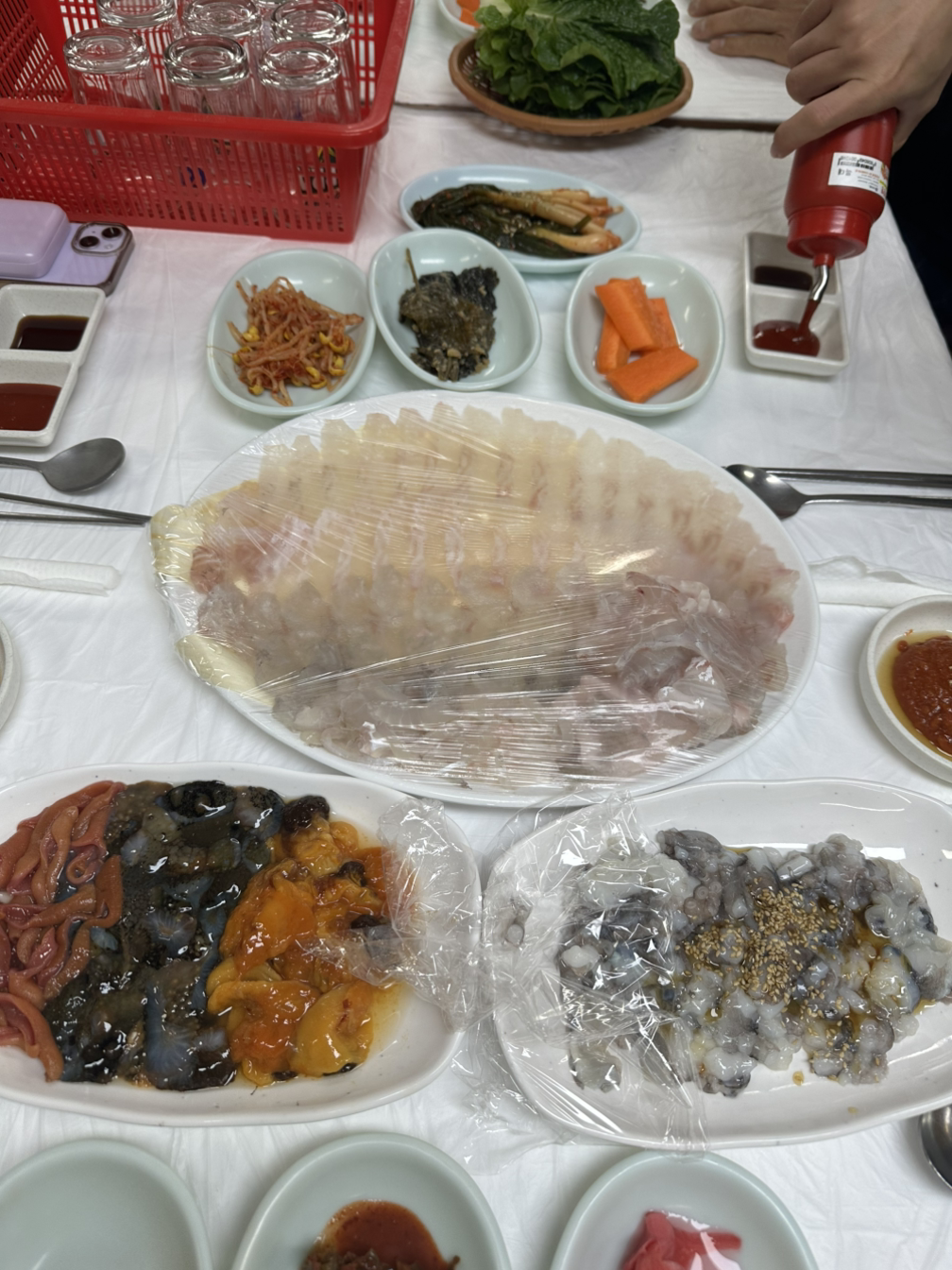 그럼에도 아무 말 없이 횟집에 따라간 것은 회를 먹을 때 함께 나오는 밑반찬이나 서비스 음식들로 식사를 대신하고자 했기 때문이다. 아~~~ 하지만 수산시장의 횟집은 그런 게 없었다. 정말 회와 생물의 해산물만 나왔다.