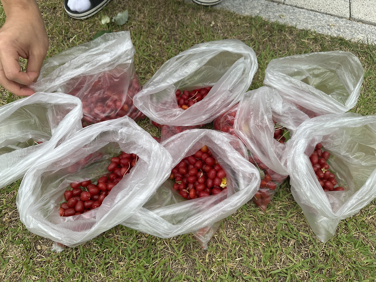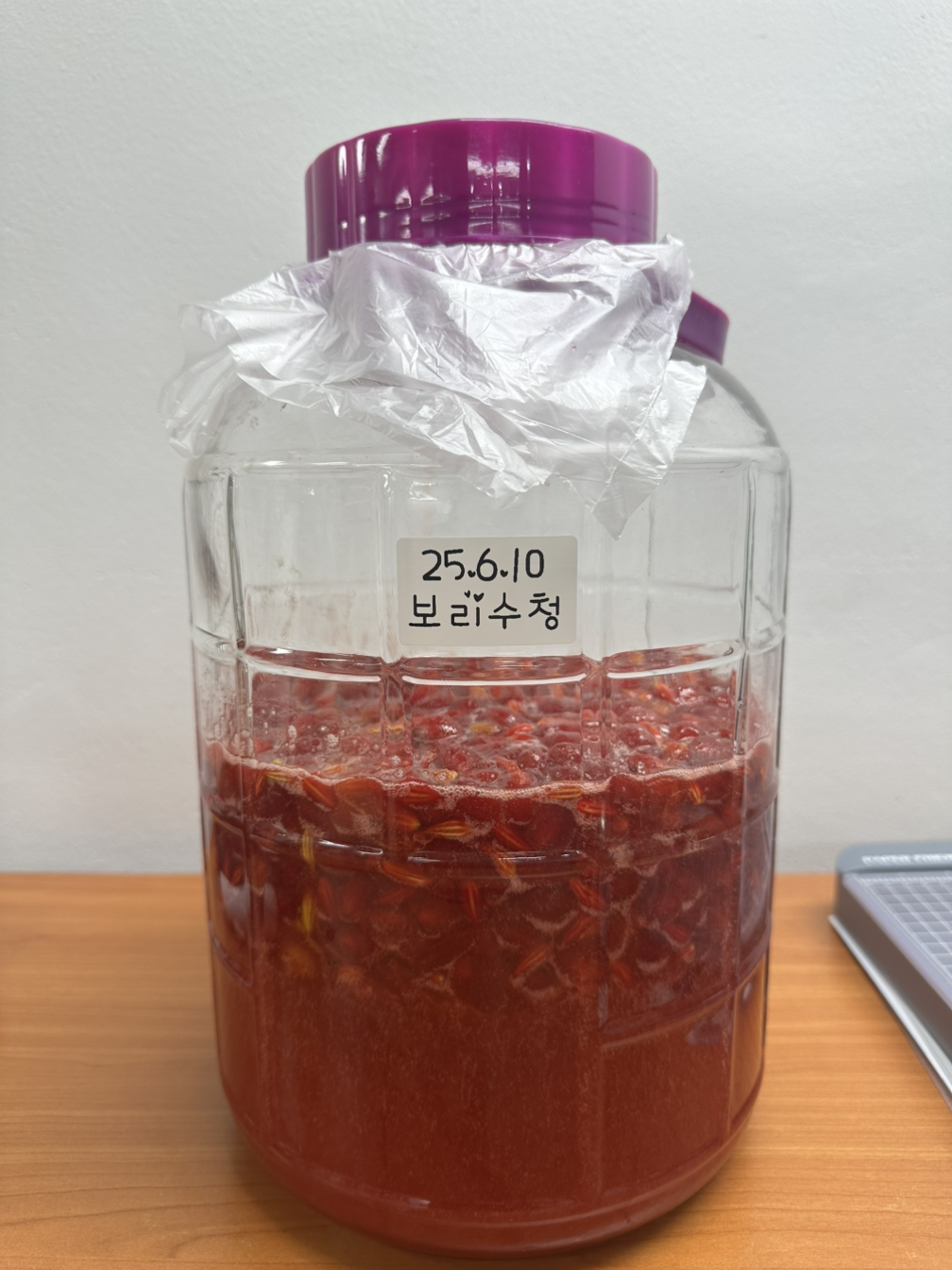 한 시간의 열매 따기 체험을 마치니 수확한 보리수나무 열매의 양이 제법 많았다. 미리 생각해 둔 '보리수청'을 만들기로 했고, 열매가 무르기 전에 청을 만들면 좋겠다는 주부 9단 교사들의 조언에 따라 병을 세척하고, 열매를 씻고, 꼭지를 따고, 설탕에 버무려 완성했다. 100일 정도의 숙성 기간이 지나면 맛이 있을지 없을지 모르지만 새로운 음료를 맛볼 수 있을 것이다.