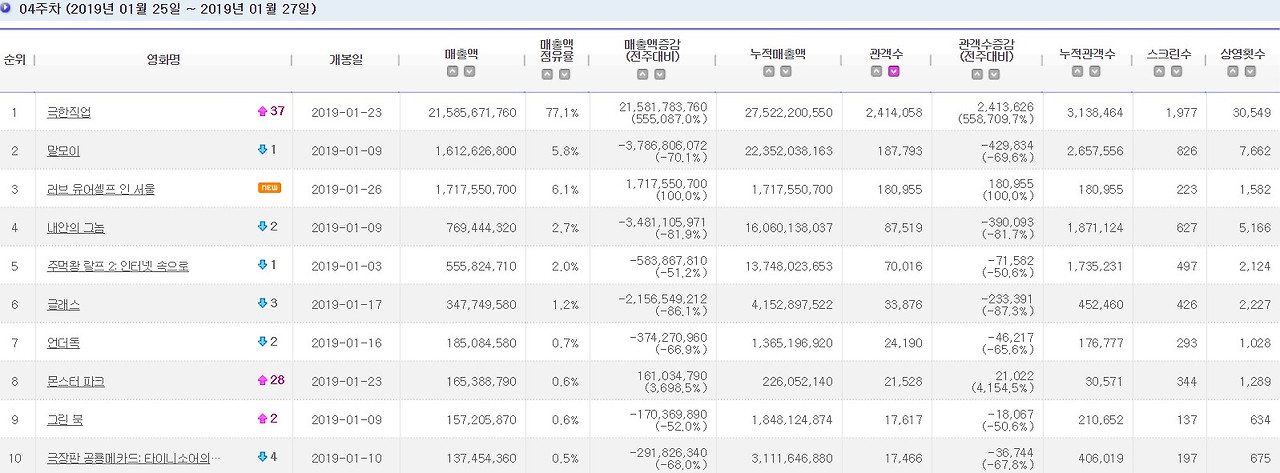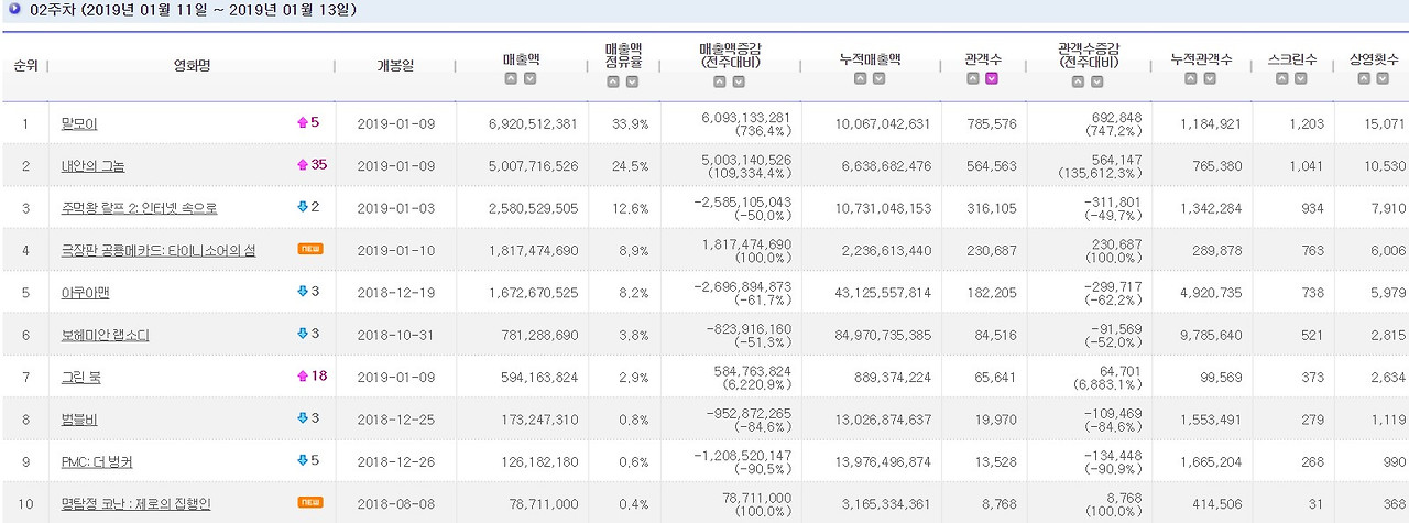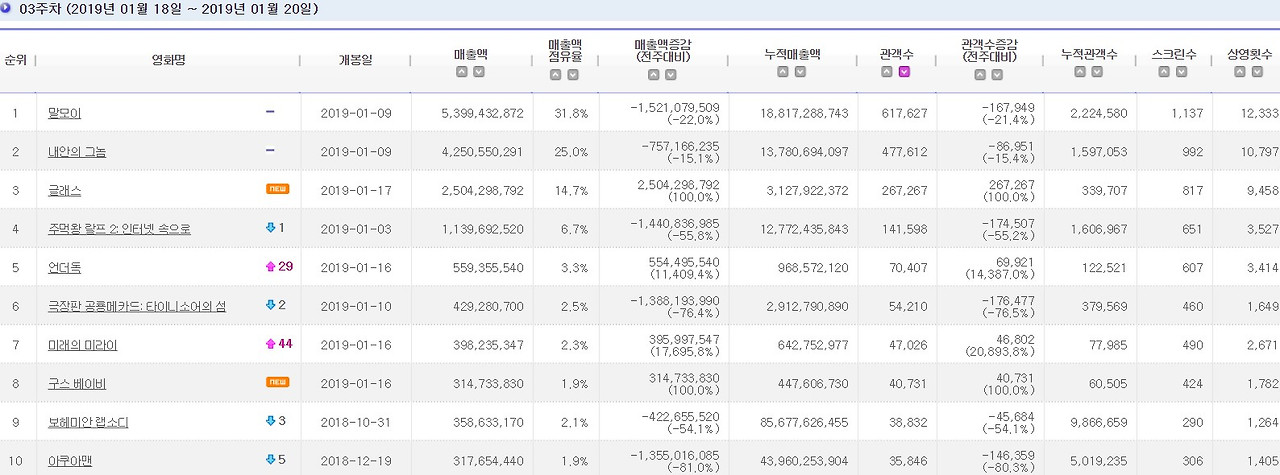 세 번째 주말은 <글래스>가 유입된 것만 제외하면 상위권 변동이 거의 없습니다. 그런 상황에서 <말모이>와 <내안의 그놈>이 전주에 비해 각각 21.4%, 15.4%의 관객만 빠져나가면서 무난하게 성적을 올립니다. 여전히 관객은 꽤 많은데 신작 유입이 없습니다.