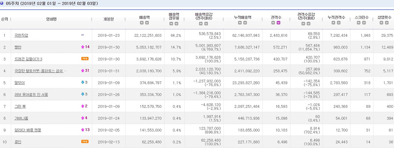 그리고 설 연휴를 한 주 앞둔 네 번째 주말, <극한직업>이 등장합니다. 여기서 주목하실 부분은 <극한직업>을 제외한 작품들의 관객수와 관객수 증감률입니다. 비교적 고르게 흥행하던 지난 세 번의 주말과는 다르게 기존에 흥행하던 <말모이>, <내안의 그놈>의 관객수가 급감(각각의 관객수 증감률은 -69.6%, -81.7%)하고 <극한직업>에 관객이 다 몰려버립니다.