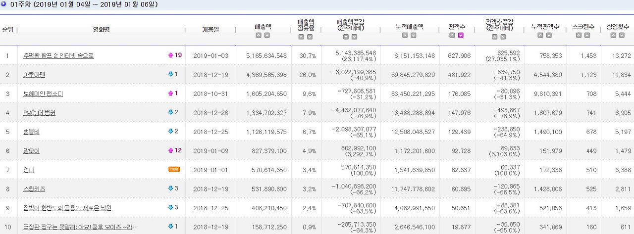 첫 번째 주말입니다. 우선 미국에서 11월에 개봉한 <주먹왕 랄프 2>가 무난한 오프닝으로 데뷔합니다. 개봉이 밀린 애니메이션이니 딱 들어맞는 조건이죠. 그런데 재미있는 것은 주말 관객수 50만 이상을 동원하는 연말 개봉작이 하나도 없다는 것입니다. 아시다시피 작년 연말에는 <스윙 키즈>, <마약왕>, <PMC: 더 벙커>를 비롯한 연말 텐트폴 영화들이 싸그리 망하면서 <아쿠아맨>과 <보헤미안 랩소디>가 수혜를 본 편이었습니다. 그러다 보니 시장을 이끌어가는 연말 흥행작이 다 죽어있는 상태였습니다.