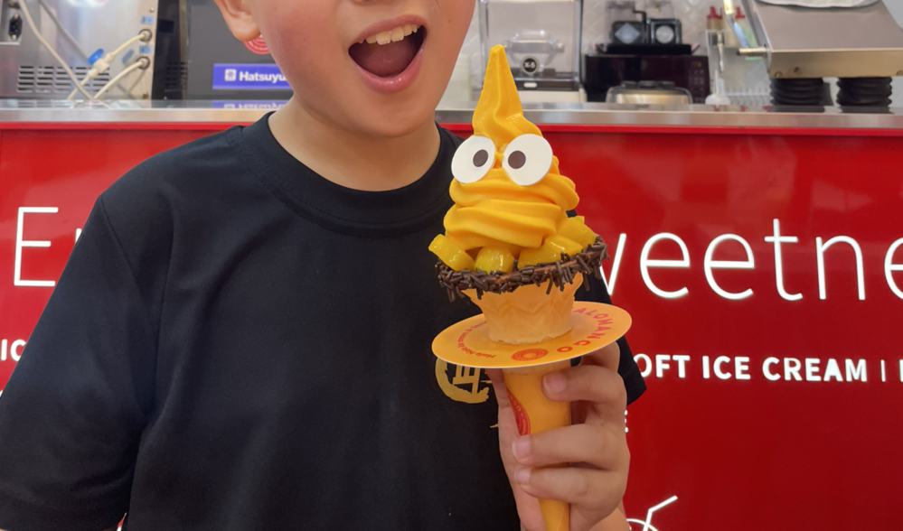 망고를 사고 할로망고로 갔다. 할로할로가 먹고싶어서 갔는데 할로할로를 너무 크게 팔아서 행운이만 망고아이스크림을 먹었다. 망고아이스크림에 눈이 달린게 아주 귀여웠다.