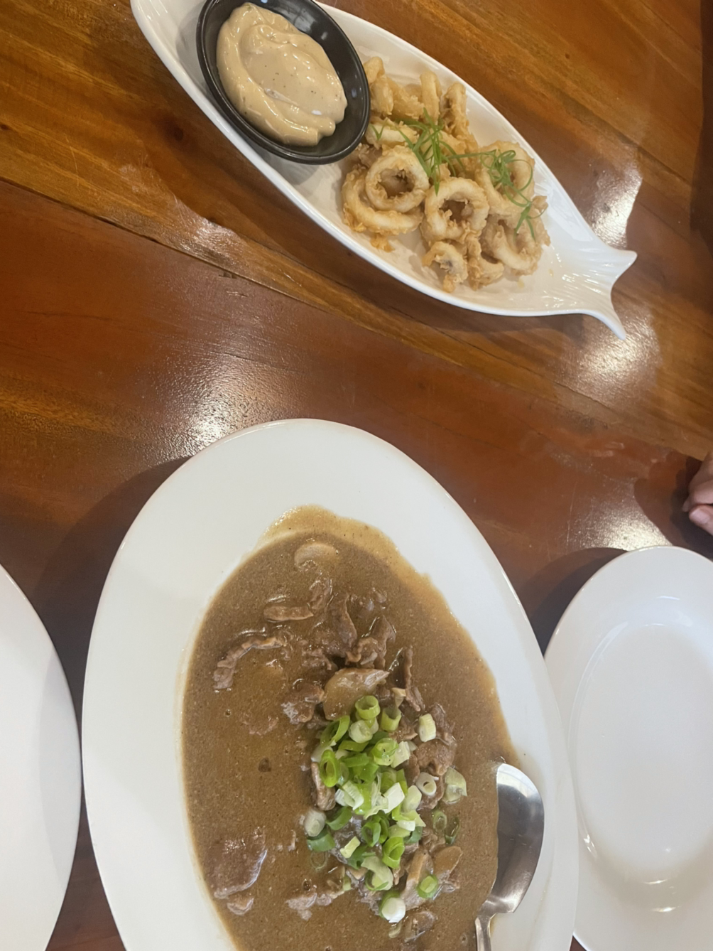 깔라마리와 비프스테이크를 시켰는데 비프스테이크는 내가 생각한 비주얼은 아니었다. 그런데 버터향이 나고 맛있었다. 간도 약간은 짰는데 아주 짜진 않고 먹을만했다. (그런데 가게에 모기가 좀 많았다. 이건 엔지!)