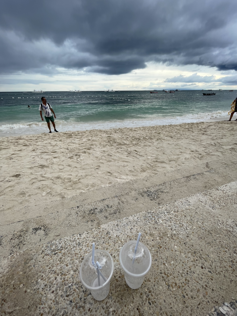 코코넛 쉐이크를 들고 바다에 들어가진 않고 해변을 걸었다. 저 멀리 먹구름이 보이고 비 기둥도 보였다.