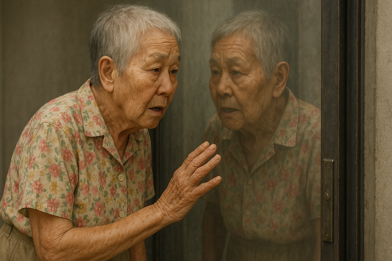 그러자 출입문 표면 속 망그러진 영순도 문 바깥세상에 서 있는 영순이 신기하다는 듯 천천히 다가왔다. 20년 전 남대문 시장에서 구입한 뒤로 색이 바랜 화려한 꽃무늬 남방셔츠와 곳곳이 해진 베이지색 통 넓은 바지를 입은 아담한 키를 가진 한 여자가 가까이 왔다.