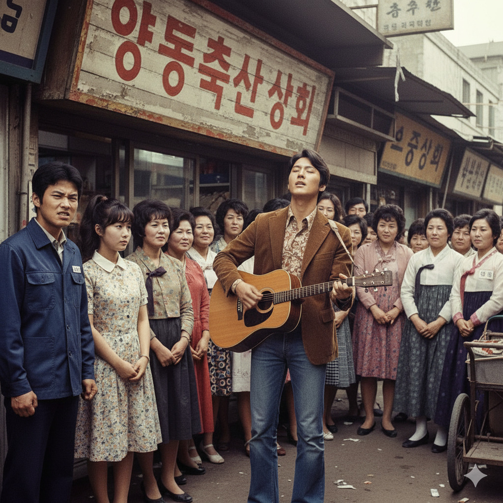 '양동축산상회'라는 글자가 새겨진 간판 앞에서 한 잘생기고 훤칠한 청년이 통기타를 치고 노래를 흥얼거리며 좌중의 시선을 사로잡았다. 그 청년의 주위를 세대를 초월한 다수의 여성들이 에워싼 채 선망의 눈길을 보내고 있었다. 그 모습을 본 춘재가 이를 갈았다.