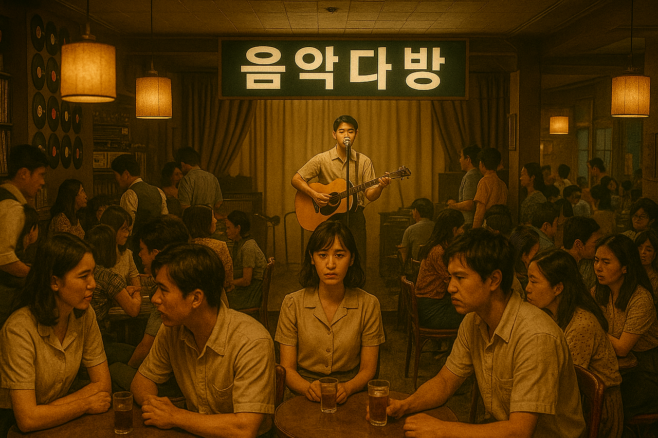 다방 한가운데 위치한 뮤직박스 앞에서 LP판을 턴테이블 위에 놓고 돌리고 있던 춘재가 향미와 동오가 앉은 테이블 방향을 향해 몸을 돌린 채 물었다. 춘재는 DJ로써 한창 맛깔나게 신청곡 관련 사연을 읊조리다가 향미가 영순에게 시비를 걸며 분위기가 깨져 시큰둥한 상태였다. 잔뜩 이골이 나 씩씩거리던 향미는 춘재가 말을 걸자 문득 좋은 생각이 났다는 듯 회심의 미소를 지었다.