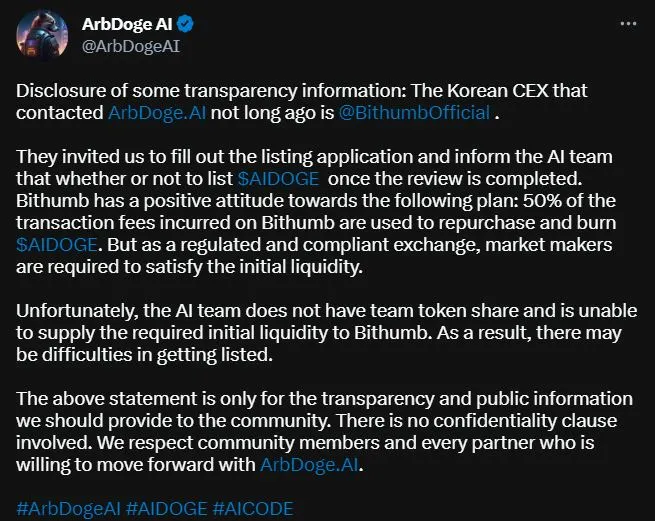 빗썸은 제2의 수이같은 프로젝트를 찾으려고 여기저기 문을 많이 두드리고 다니는 것 같다. 요즘 코인판에서는 페페코인 이후 밈 코인이 한창 핫한데, 핫한 밈 코인 리스트 중 하나인 프로젝트가 빗썸에서 상장 컨택을 받았다고 밝혀 화제를 모았다. 바로 인공지능으로 제작된 아비트럼 블록체인 기반 밈 코인 아브도지(AI도지)다.