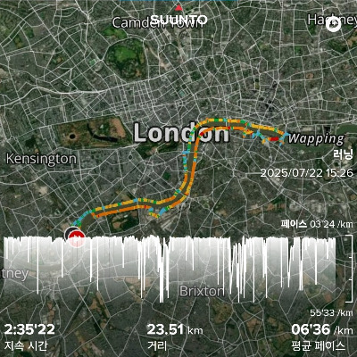 여행 첫날 아침의 감동을 가득 안은 채 숙소로 향하는 길. 너무 멀리 오긴 했다보다. 14시간의 비행을 마친 다음 날 아침의 피로가 다리로 몰려오고, 썩 좋진 않은 강북면의 길에 오른발을 접질려 등골이 오싹해지기도 했다. 다행히 그간 쌓아온 러닝 구력 덕분에, 몇 번의 스트레칭으로 오른쪽 발목은 완주하는데 무리 없었고, 그렇게 하프마라톤 보다 긴 23.5Km 템즈강 러닝을 마무리했다.