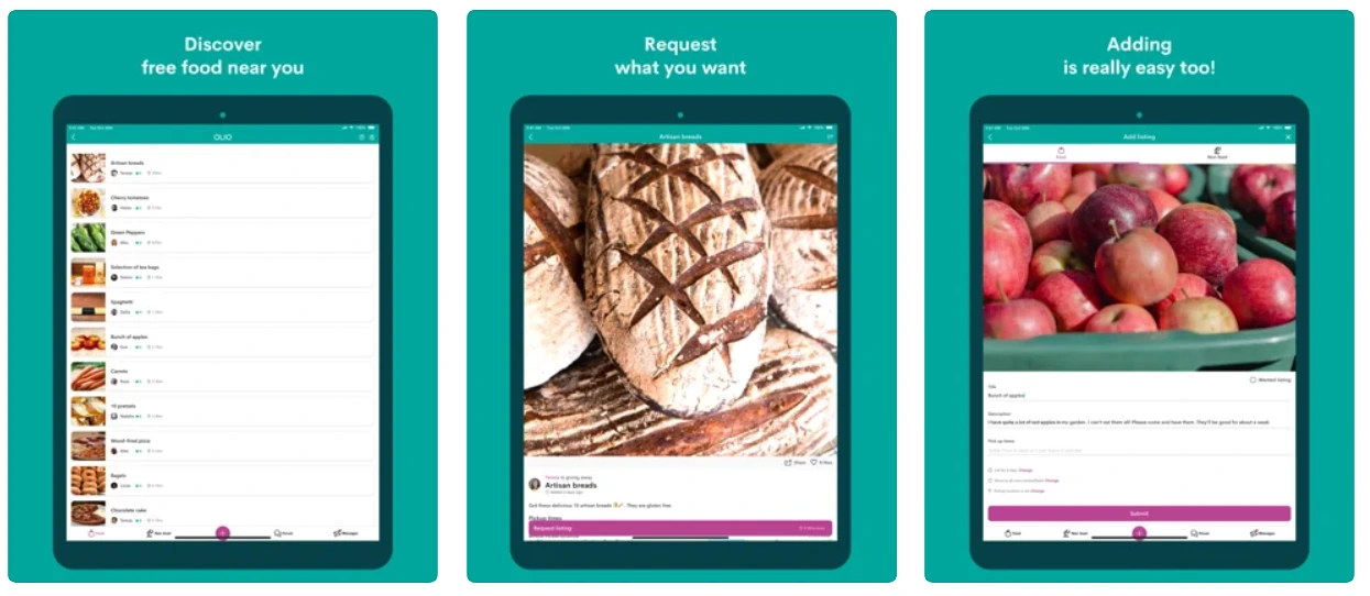 Olio는 음식물 쓰레기 줄이기를 목표로 하는 음식 나눔 모바일 앱이다. 그것은 잉여 음식을 가진 사람들을 그러한 음식을 필요로 하거나 소비하고자 하는 사람들과 연결함으로써 이를 수행한다.