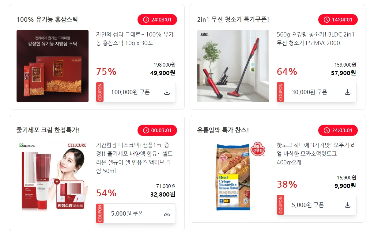 주로 과자나 베이커리, 음료, 즉석식품이지만 상대적으로 유통 기한이 긴 건강기능식품이나 화장품은 최대 99% 파격 할인가에 풀리기도한다.