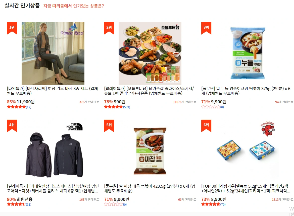 가장 많이 판매되는 제품: 의류(공동구매식 의류인것으로 추정, SPA 스포츠 브랜드), HMR(가정간편식)