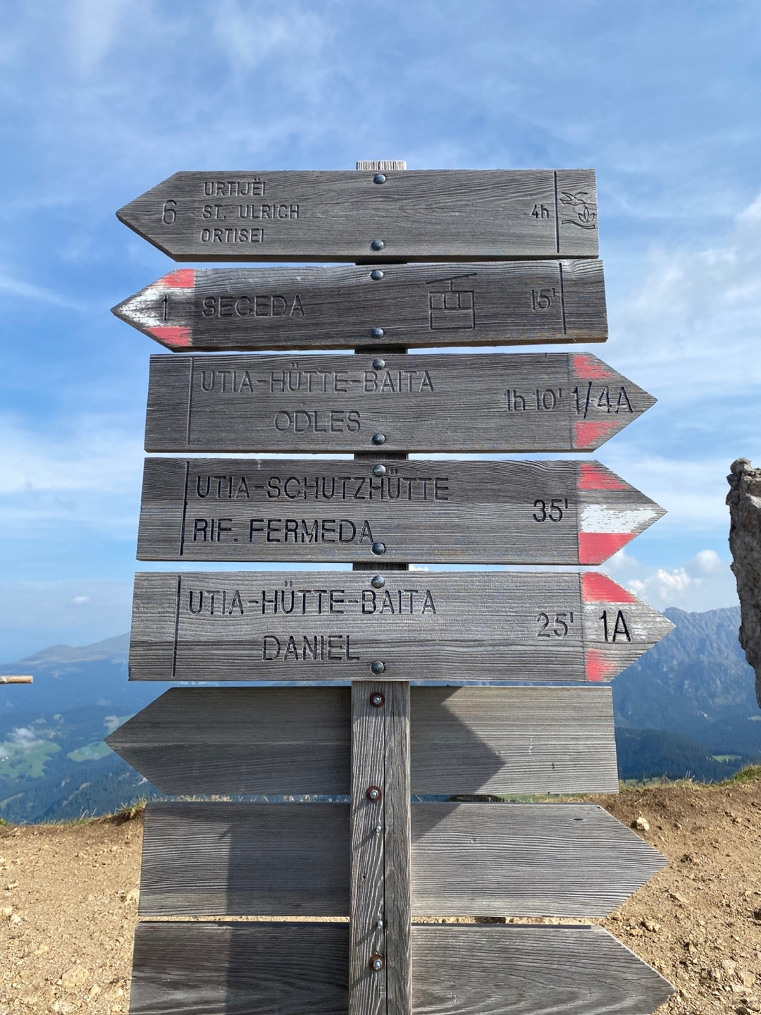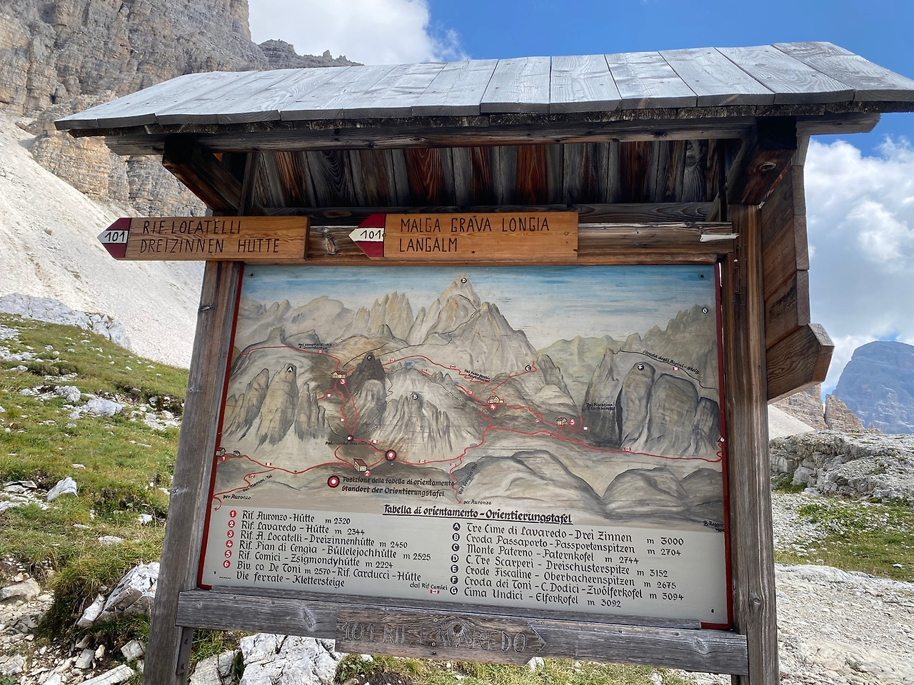 �표지판 : 한국에서 등산할 때엔 비교적 표시되어 있는 시간이 맞는 편인데 돌로미티의 표지판은 규모에비해 표지판 수도 적을뿐더러 시간도 짧게 표시되어 있다.(다리 긴 남성 현지인의 쉬지 않고 걸었을 때의 시간인 걸까…?)