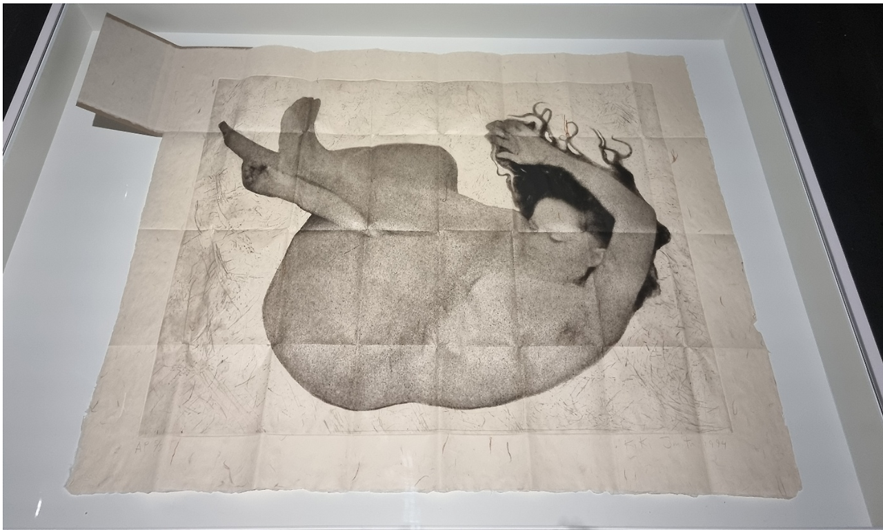 꼭꼭 접힌 종이 위로 한 여인이 웅크리고 있다. 물속인지 우주인지 중력의 힘이 닿지 않는 공간에 있는 것 같다. 그녀는 거추장스러운 옷도 장신구도 아무것도 걸치지 않고 마치 지금 막 엄마의 품에서 나와한 없이 나약한 상태로 세상을 마주한 것 같다. 그림이 그려진 종이가 균일한 간격으로 접혀있다가 펼쳐진 모습도 마치 엄마의 품 같다. 흑백의 그림이지만 차갑지 않고 자유로움이 느껴진다. 곱게 접어 품에 넣을 수 도 있겠다.