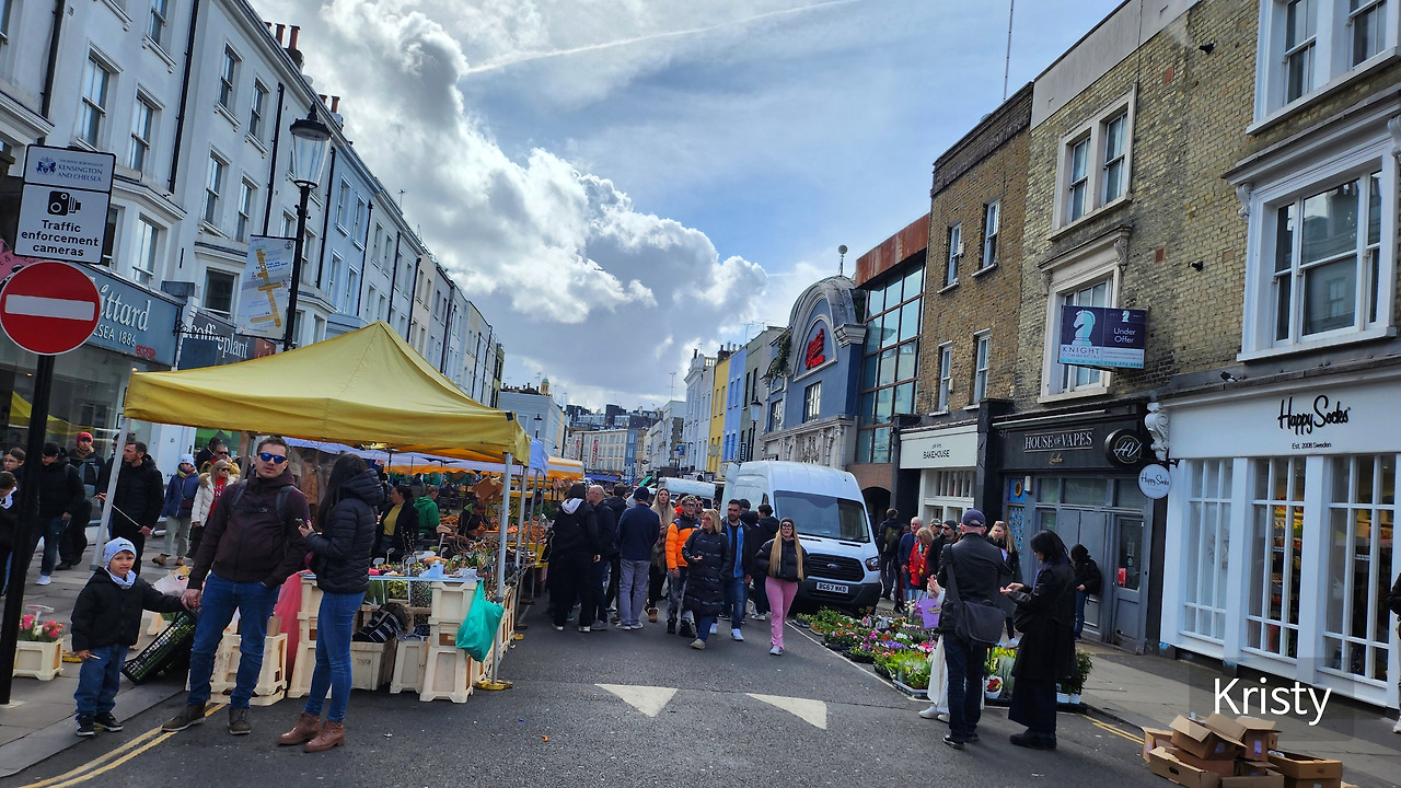 여린 연둣빛의 새싹을 머금은 거대한 가로수들이 예쁜 사우스 켄싱턴 숙소에서 우버를 타고 약 10분 정도 이동했다. 부모님과의 유럽여행의 필수는 우버 택시인데, 이유인즉슨, 대중교통을 이용하며 불필요한 체력소비를 막을 수 있기 때문이다. 그렇게 짧게 택시를 타고 이동하여, 장장 1km 정도에 달하는 포토벨로 마켓플레이스를 둘러본다.