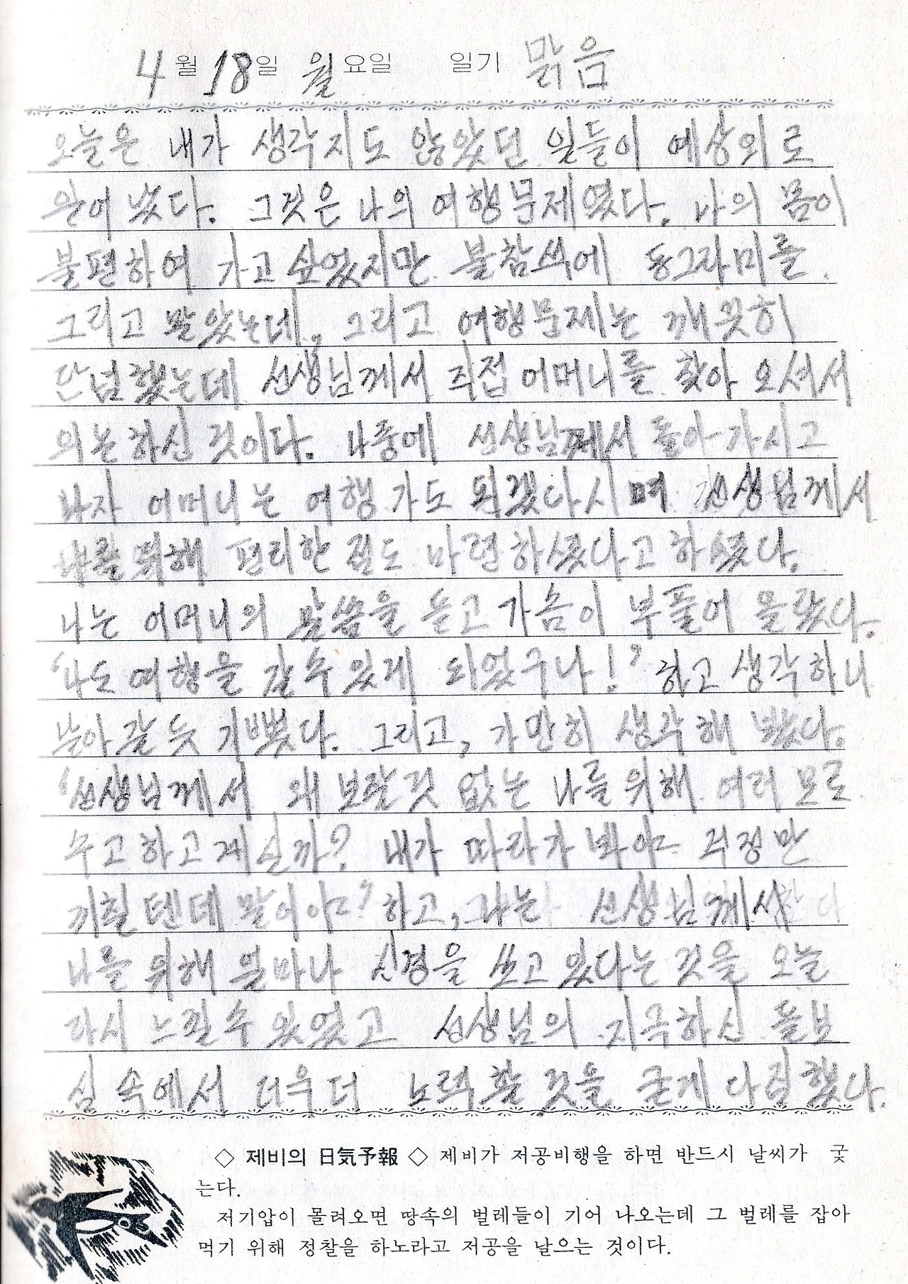 선생님은 나의 일기장을 보고 수학여행을 가고 싶어 하는 나의 속마음을 우연히 알게 되었다고 했다. 요즘 초등학교 생활은 모르겠지만 당시에는 일기장 검사라는 것을 했다. 도장도 찍어주고 간단한 멘트도 남겨 주셨다.
