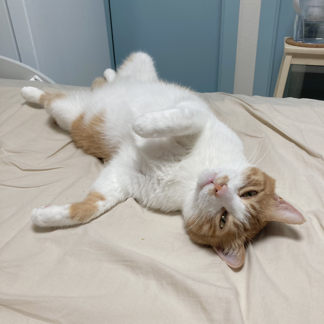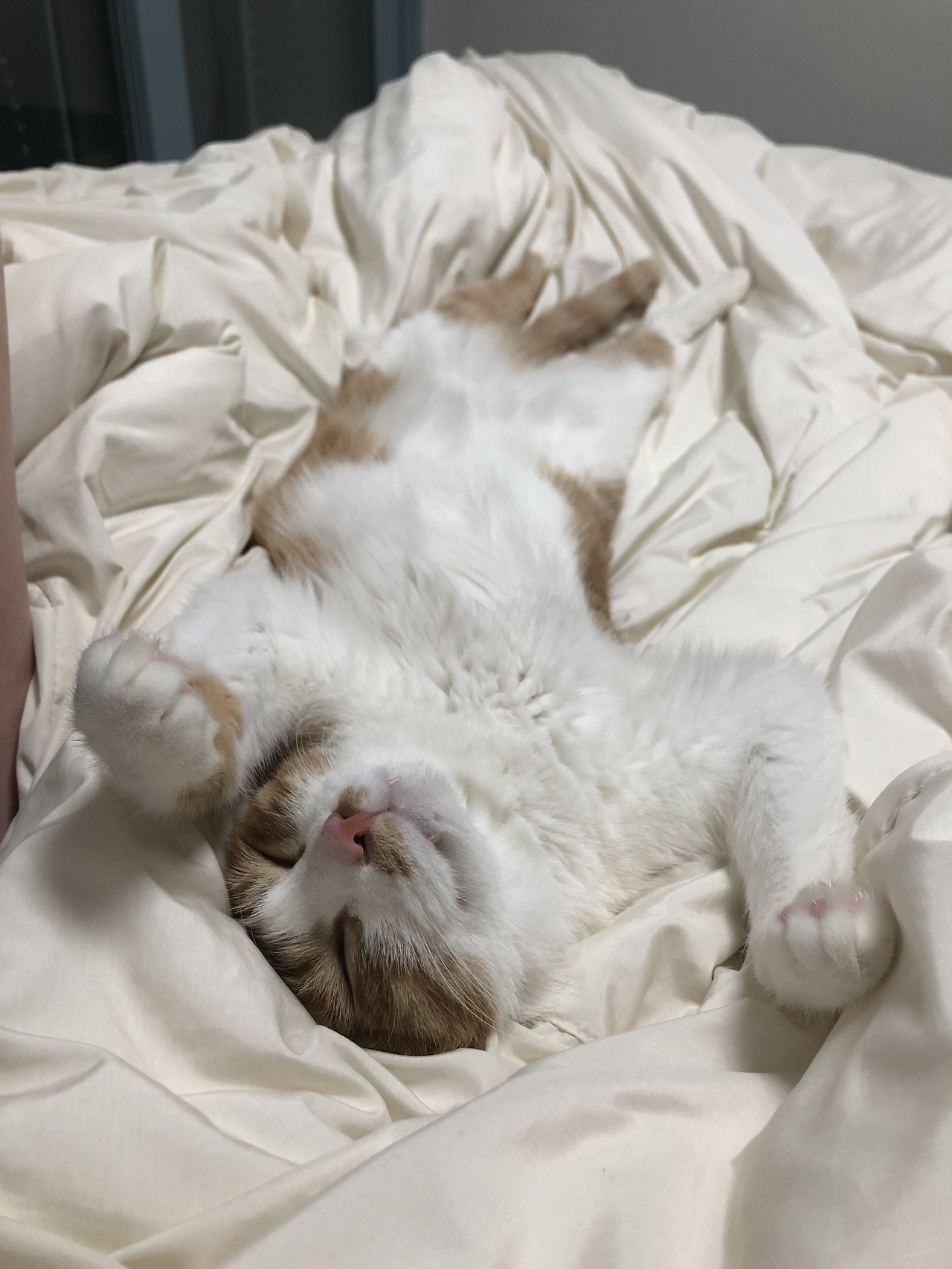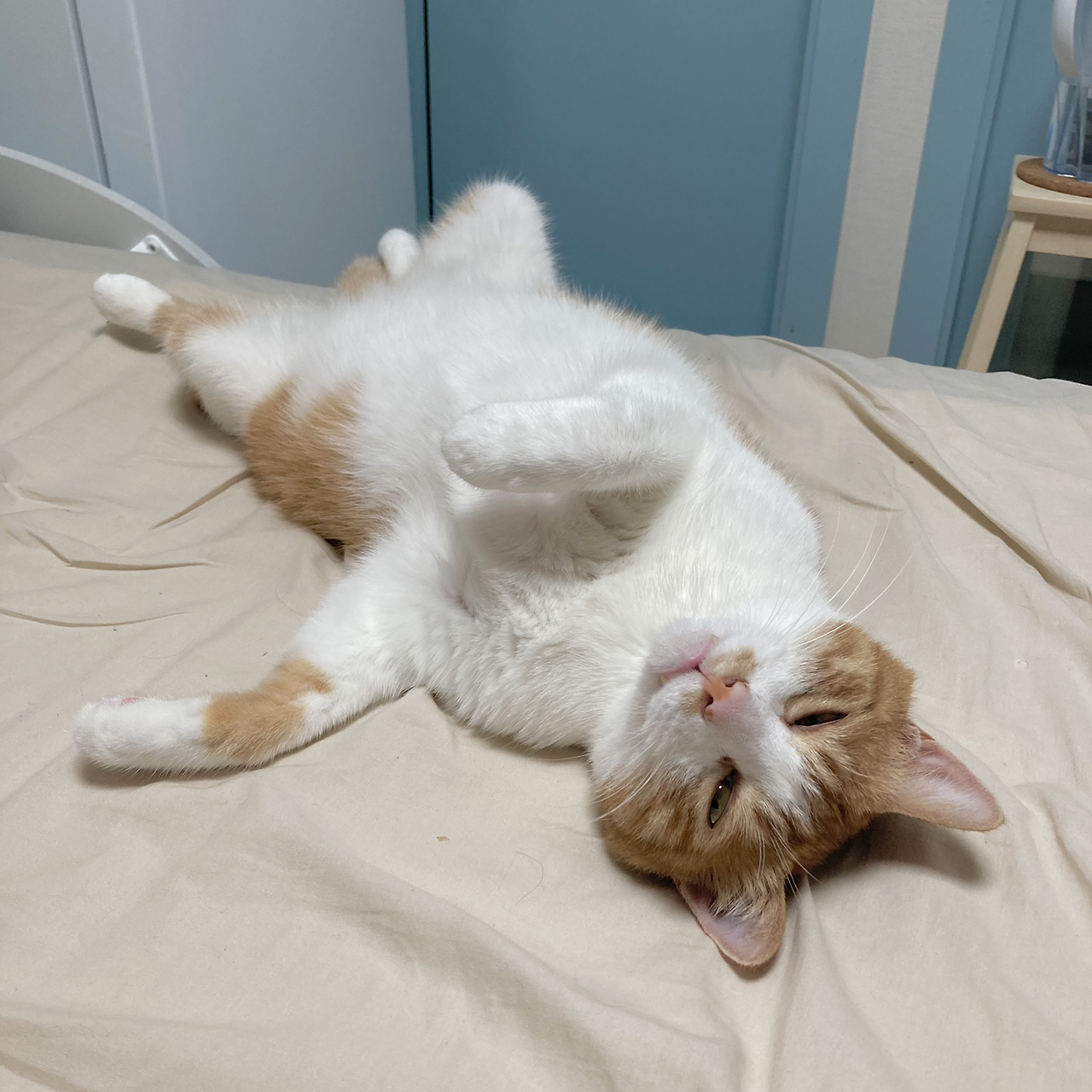 그런데 모디는 기골까지 워낙 장대해서, 집사가 다리를 편안하게 놓고 자면 허벅지 사이의 공간은 이 녀석의 몸집에 비해 턱없이 좁아지게 됩니다. 그러면 억지로 몸을 쑤셔 넣어 허벅지 사이에 공간을 만들어 내려고 하고, 힘도 장사라 저는 어쩔 수 없이 다리를 마름모 모양으로 벌리게 될 수밖에 없습니다. 한밤중에 난데없이 요가 자세를 하게 되는 것이에요. 저는 요가와는 태생적으로 거리가 먼 사람이고, 학창 시절 체력장 때마다 유연성 최하점을 받은 사람입니다. 한 마디로 제게는 지독하게 불편한 자세이지요. 게다가 저는 똑바로 눕지 않으면 잠에 들지 못하는 사람이라 다리를 좀 오므려서 어떻게든 쭉 펴 보려고 합니다.