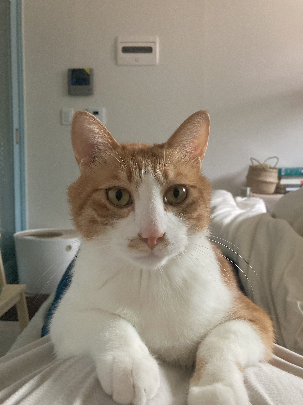 모디는 자연스럽고 조용히 침대에 올라오는 일이 결코 없습니다. 고양이가 야옹 소리 말고도 다른 소리들을 자주 낸다는 사실을, 집사들 이외에는 잘 모르실 것입니다. 꿱, 냐악, 무아악, 먀아아아, 뭐 이런 소리들을 더 많이 내요. 이럴 거면 왜 야옹이라고 부르는지. 아무튼 발소리가 거의 들리지 않기 때문에 침대 아래에 모디가 있으면 어디 있는지 도통 알 수가 없는데, 저런 소리들을 내며 뛰어 올라오면 깜짝 놀라기 마련입니다. 그래도 이 시험은 통과하기가 비교적 쉬운 편입니다.