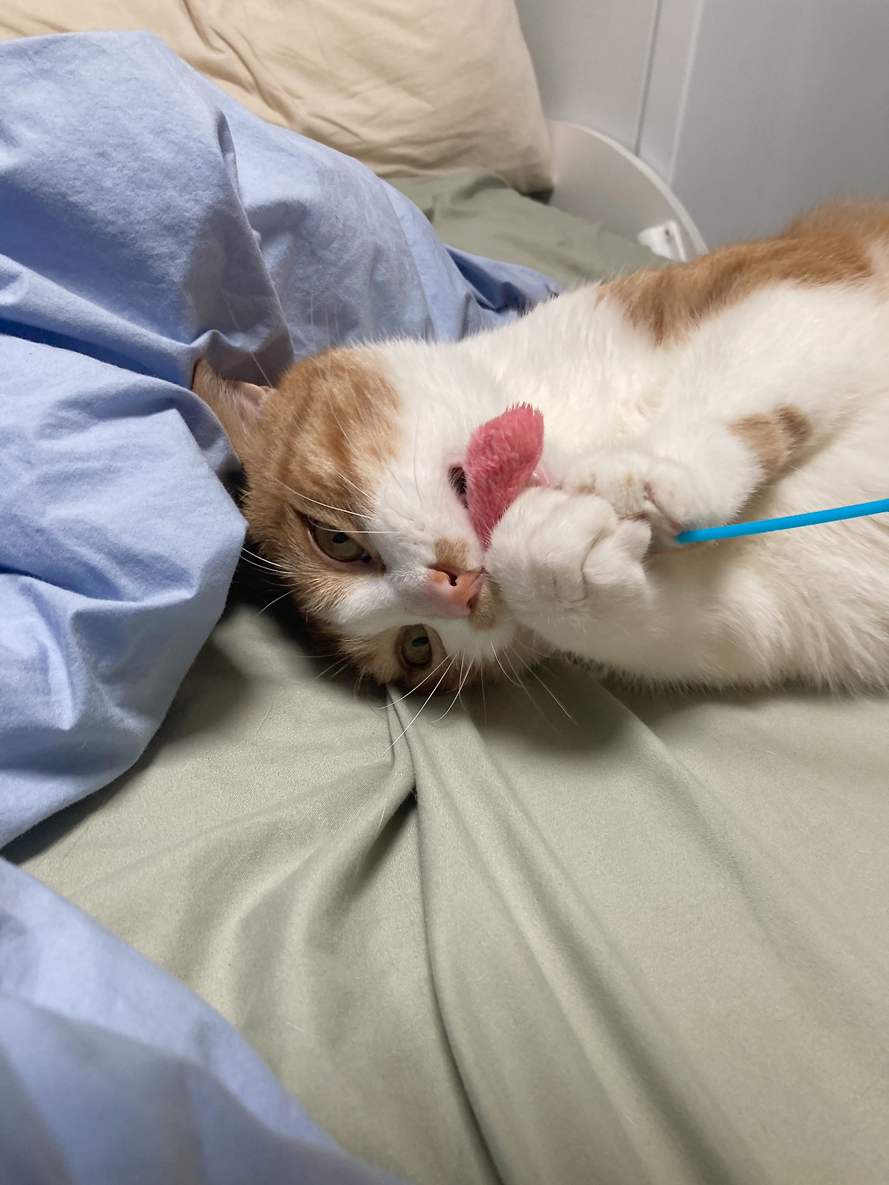 한편 후자일 때에는 예열 과정이 전혀 필요하지 않습니다. 장난감을 보자마자 뛰어들어서 마구 돌기 시작하는데 이때 너무 흥분한 상태이기 때문에 침대 밑으로 떨어지거나 벽에 부딪힐 수 있으니 주의해야 합니다. 한 번의 사냥이 끝나고 나면 이번엔 반대편으로 가 다시 전 과정을 반복합니다. 분명히 잡았는데 왜 저것이 또 눈앞에 있는지 의아하다는 표정도 잠시, 뇌가 재가동되기라도 한 듯 필사적으로 장난감을 쫓습니다. 그렇게 한참을 놀고 나서 코 앞에 손가락을 갖다 대 봅니다. 찬 콧바람이 자그마한 코에서 휭휭 나오면 모디는 만족스러운 사냥을 한 것이랍니다. 지쳐서 옆으로 드러누운 모디가 씩씩거림에 따라 위아래로 움직이는 뱃살을 보면 오늘도 안심할 수 있습니다. 최소한 야밤에 와당탕거릴 체력은 다 빼놓은 것이니까요. 모디도 이제 아저씨가 되어서 예전보다 훨씬 금방 사냥을 그만두지만, 능력을 증명하고픈 마음은 여전해 보입니다. 그러니 사냥이 성공적으로 끝났다 싶으면 장난감을 얼른 치우고 의기양양하게 사료를 먹을 수 있도록 해 주는 것이 중요하겠지요.