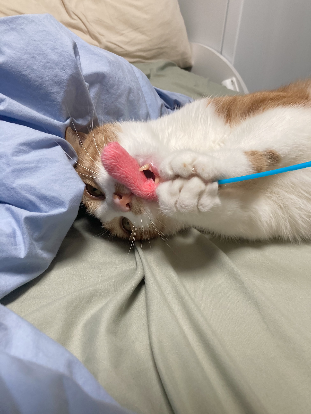 이때는 모디의 얼굴에 장난감을 부비적거리면서 도발을 가하거나, 장난감을 이불 위로 크게 움직이면서 사그락거리는 소리를 내줘야 합니다. 이 대치 상태가 3분 정도 반복되면 모디는 장난감을 향해 달려들고, 저는 팔을 뒤로 빼는 동시에 뒷걸음질을 치면서 모디가 적당한 거리를 뛸 수 있도록 합니다. 다음엔 장난감을 뒤나 옆으로 움직이는데, 뒤로 움직이면 모디가 점프를 하면서 휭 날아가게 되고 옆으로 움직이면 장난감을 따라 빙글빙글 돌게 됩니다. 시트에 발톱자국을 잔뜩 내면서 침대 위를 신나게 뛰어다니는데, 시점을 잘 맞춰서 마지막엔 항상 모디가 앞발로 장난감을 붙잡을 수 있게 해 줘야 해요. 그렇지 않으면 스스로의 사냥 능력을 의심하게 될 테니까요. 강아지풀 장난감이나 레이저를 사용할 때에도 시점을 잘 맞추는 것이 필수인데, 특히 레이저는 앞발에 닿는 순간을 잘 노렸다가 바로 꺼 줘야 사냥에 성공했다는 표지를 줄 수 있답니다. 지금은 좀 덜하지만 어렸을 때는 한 시간을 이렇게 놀아도 지칠 줄을 몰랐습니다.