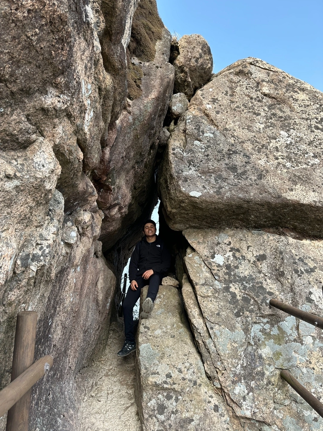 가다보니 구름다리로 가는 갈림길이 나왔다. 동절기에는 안전을 위해 구름다리부터 천황봉 사이는 등산로를 폐쇄하기 때문에 천황봉까지 오르려면 바람폭포 쪽으로 가야만 했다. 구름다리를 갈까 말까 잠깐 고민되었는데, 저 위에 바위들 사이로 아득히 보이는 다리를 올려다보니 저걸 건너지 않으면 후회가 남겠다는 생각이 들었다. 그렇게 나와 남편은 구름다리로 향했고 아빠는 도가니가 아프다시며 엄마랑 같이 폭포에서 잠깐 쉬면서 우릴 기다려주시기로 했다.