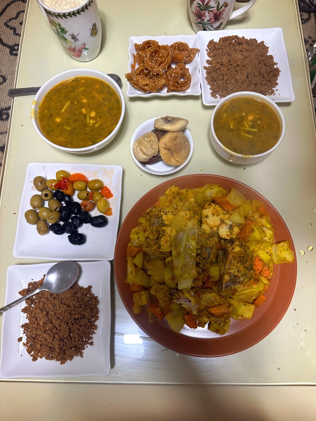 모로코에서는 라마단 식탁에 '쉬빠끼야'와 '슬루'가 빠질 수 없다. 쉬빠끼야는 우리나라의 약과와 조금 비슷한 맛이 나는 전통 과자이다. '스푸프'라고도 부르는 슬루는 계피와 각종 견과류 등을 갈아서 섞어 만든 것인데 건강에도 좋고 힘을 내는 데 도움이 된다 해서 라마단에 빠질 수 없는 간식이다. 위의 사진에서 윗줄 가운데에 놓인 깨가 뿌려진 과자가 쉬빠끼야, 위아래로 두접시를 놓은 갈색 가루가 슬루다.