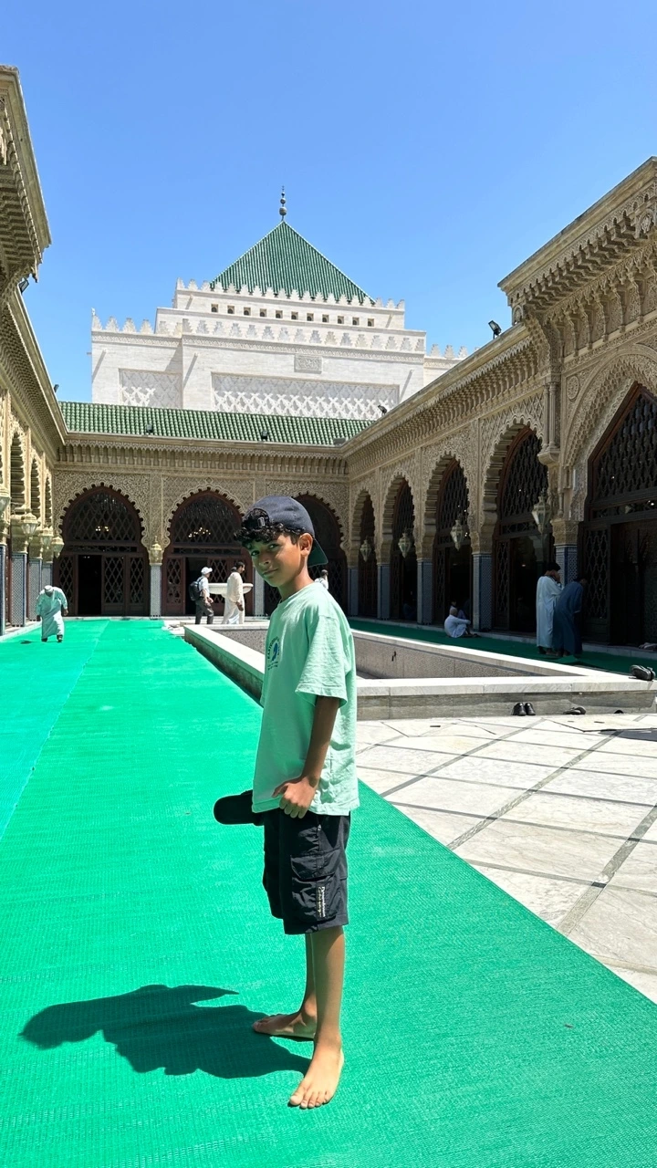 하산탑 앞의 모스크 안에서. 기도를 하러 들어갈 땐 신발을 벗어야 한다. 야신의 뒤로 모로코 왕실의 묘가 보인다.