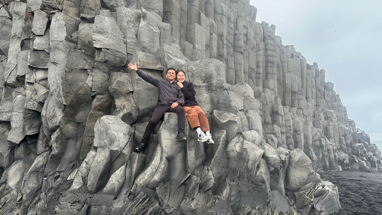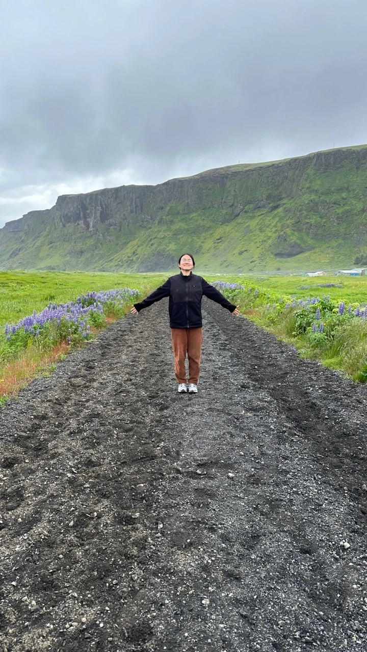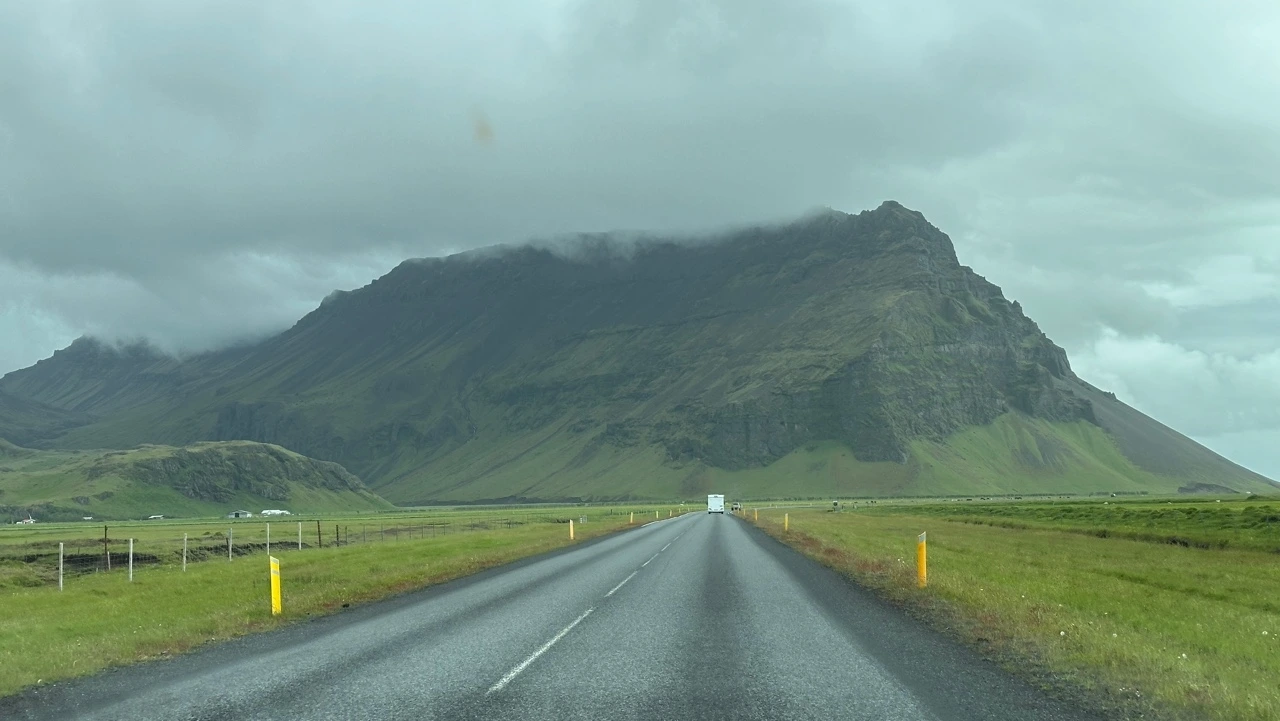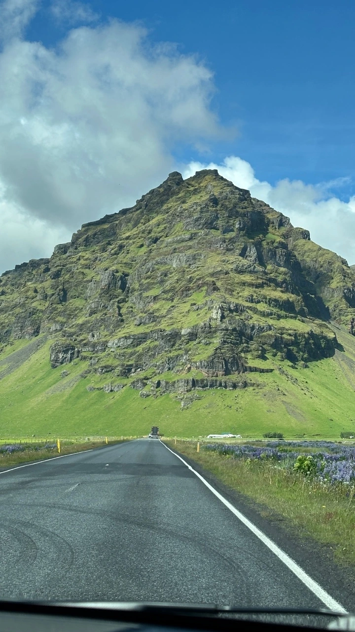 다음으로 아이슬란드 최남단의 도시 비크(Vík)에 있는 검은 모래 해변을 보러 갔다. 비크로 가는 길, 구름이 걷히면서 반짝 해가 나온 사이에 찍은 도로의 풍경이 참 예뻤다. 시시각각 변화무쌍하여 언제 다시 비가 내릴지 모르는 아이슬란드의 변덕스러운 날씨 때문에, 맑은 하늘이 보이는 이 순간이 정말 소중하다.