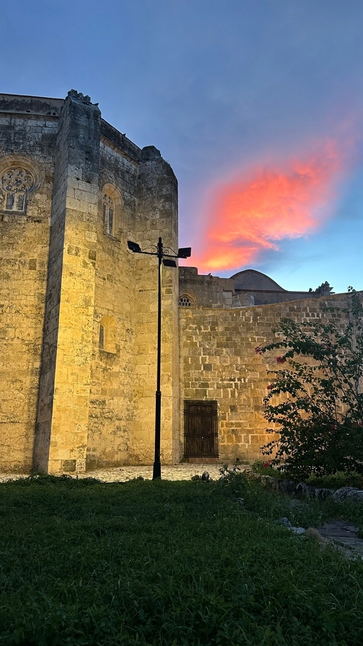 오래된 성당 뒤로 보이는 분홍색 구름이 참 예쁘다