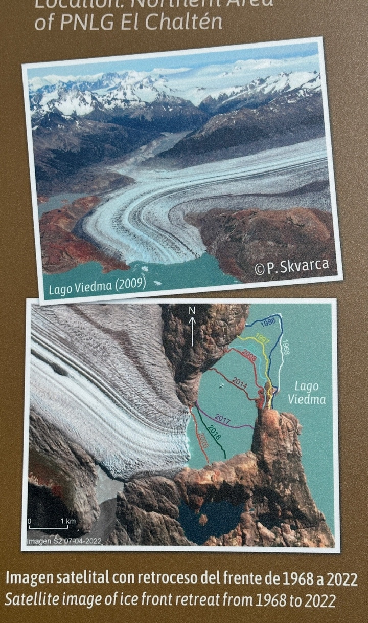 아래의 사진으로 모레노 빙하가 처한 실상이 또렷이 보인다. 위성사진에 찍힌 빙하는 1968년부터 2020년대인 지금까지 한결같이 줄어들고 있다. 아주 빠른 속도로.