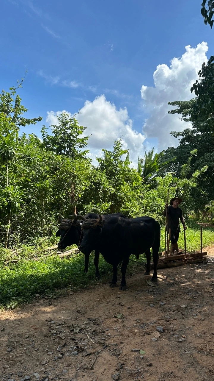 바퀴 없는 소 달구지가 흙 위를 미끄러져 간다.