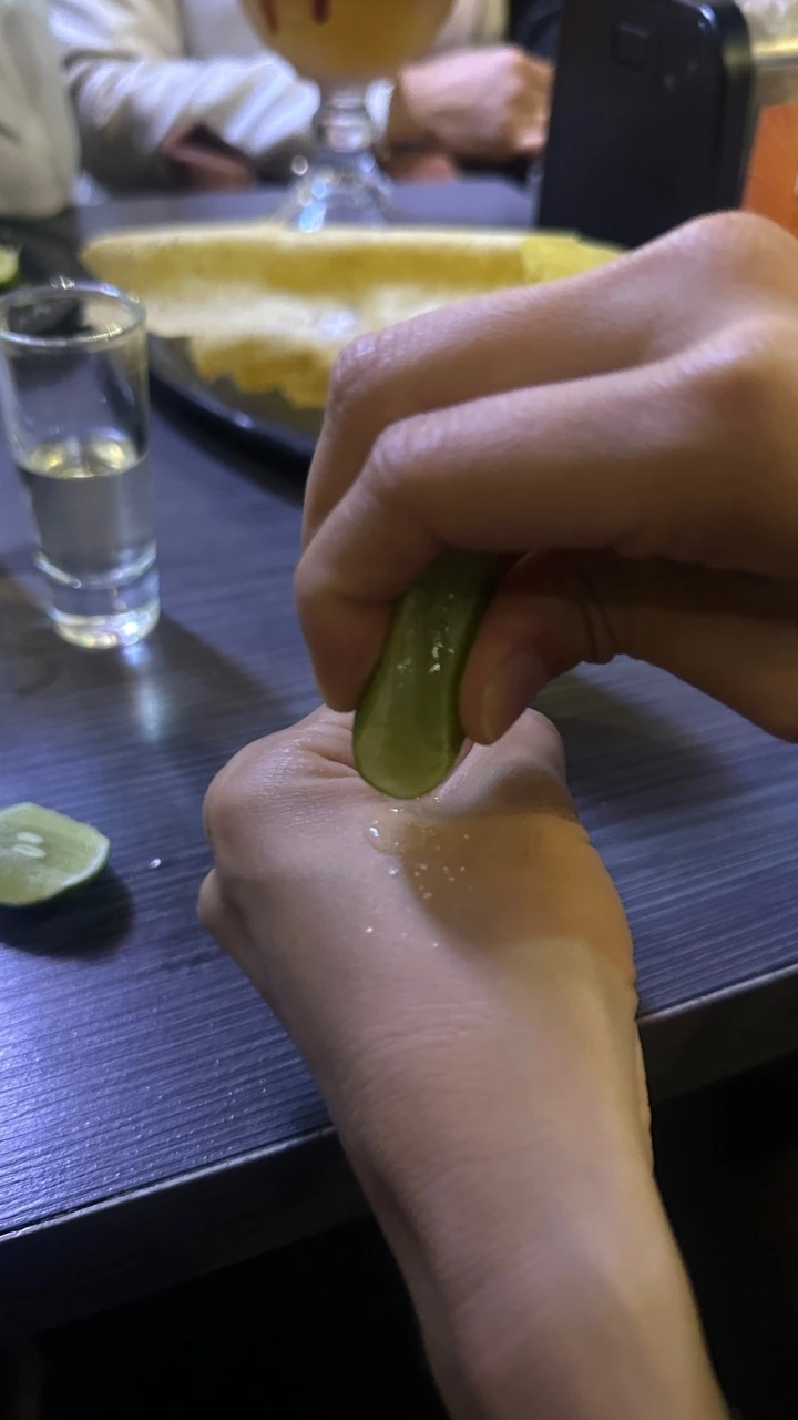 조금 독하더라도 다른 음료와 섞지 않고 데킬라만 마시는 것이 맛으로는 더 깔끔한 것 같다. 보통은 레몬 소다와 섞어서 마시는 데킬라이지만 이번엔 멕시코식으로 순수 데킬라만 마셔보기로 했다. 멕시코에서는 데킬라의 독한 알코올 향을 순화시키기 위해 라임과 소금을 이용한다. 손등의 검지와 엄지사이 공간에 라임즙을 두어 방울 짜서 떨어뜨린 다음 그 위에 소금을 톡톡 조금 친다. 그 다음 데킬라를 한모금 마시고 손등에 만들어 둔 새콤 짭짜름한 소금라임즙을 홀짝 빨아먹으면 독한 술맛이 덜 느껴지는 것이다.