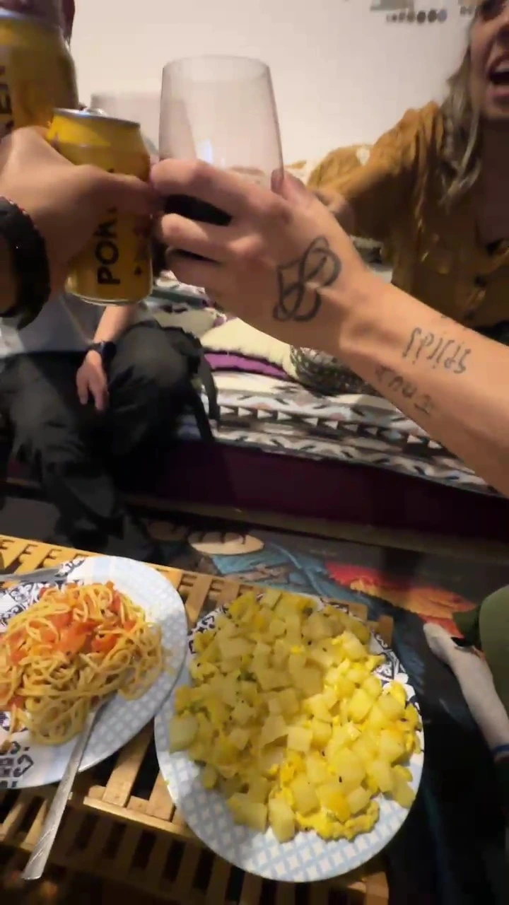 저녁 메뉴는 남편과 내가 만든 토마토 스파게티와 감자달걀볶음이다. 우리가 음식을 하는 동안 조엘은 와인을 꺼내 준비해주었다. 거실의 작은 테이블에 옹기종기 접시를 놓아 상을 차리고 노트북으로 음악까지 틀어 놓으니 레스토랑이 부럽지 않았다.