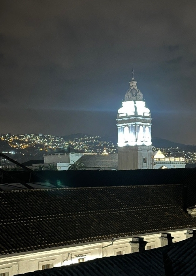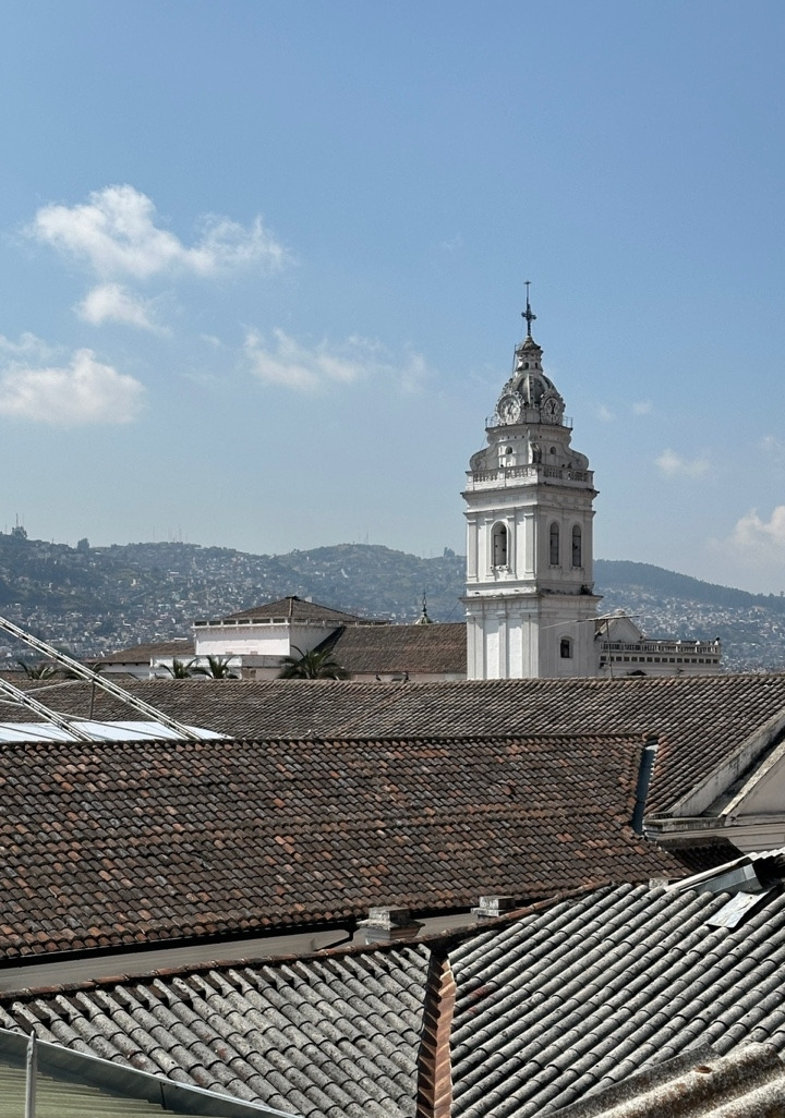 국경을 넘을 무렵부터 남편은 많이 아팠다. 원래 편도가 자주 붓곤 하는데 이번에도 편도염이 도진 것이다. 밤새 열이 나고 목소리도 깊숙이 잠겨버렸다. 그 때문에 에콰도르에서는 내내 맥을 못추고 대부분의 시간을 약먹고 숙소에서 쉬었다. 다행이었던 게 숙소가 지내기에 썩 괜찮았다. 우리의 숙소는 검색해서 나온 가장 저렴한 호스텔이었기에 그저 위생만 나쁘지 않아도 감사하겠다는 생각으로 체크인을 했다. 그런데 깔끔할 뿐 아니라 운좋게도 방이 꼭대기 층의 모서리에 위치하여 기대에도 없던 멋진 전망을 감상할 수 있었다.