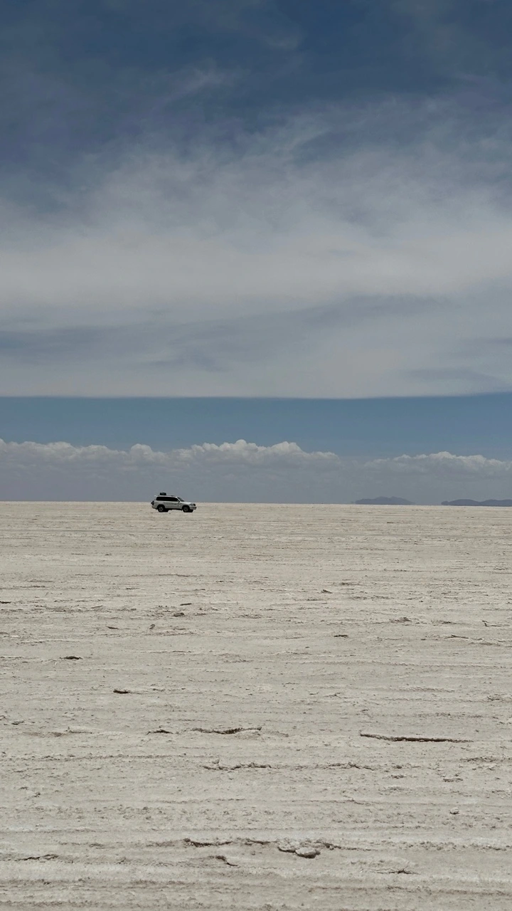 기차무덤을 지나 차로 얼마간을 달려 사막에 들어서자 주변이 온통 하얀 소금벌판이었다. 우리를 비롯해 다른 투어사들에서 온 차들이 일제히 한 방향으로 운전하여 달려가고 있었다. 가이드님이 시속 120km를 넘는 고속으로 운전을 하고 계신데도, 가도 가도 끝이 안 보이는 사막만이 펼쳐지니 그 속도가 잘 체감되지 않았다. 다른 투어 차량과 앞서거니 뒤서거니 레이스를 해가며 우린 소금 사막의 더 안쪽으로 이동했다.