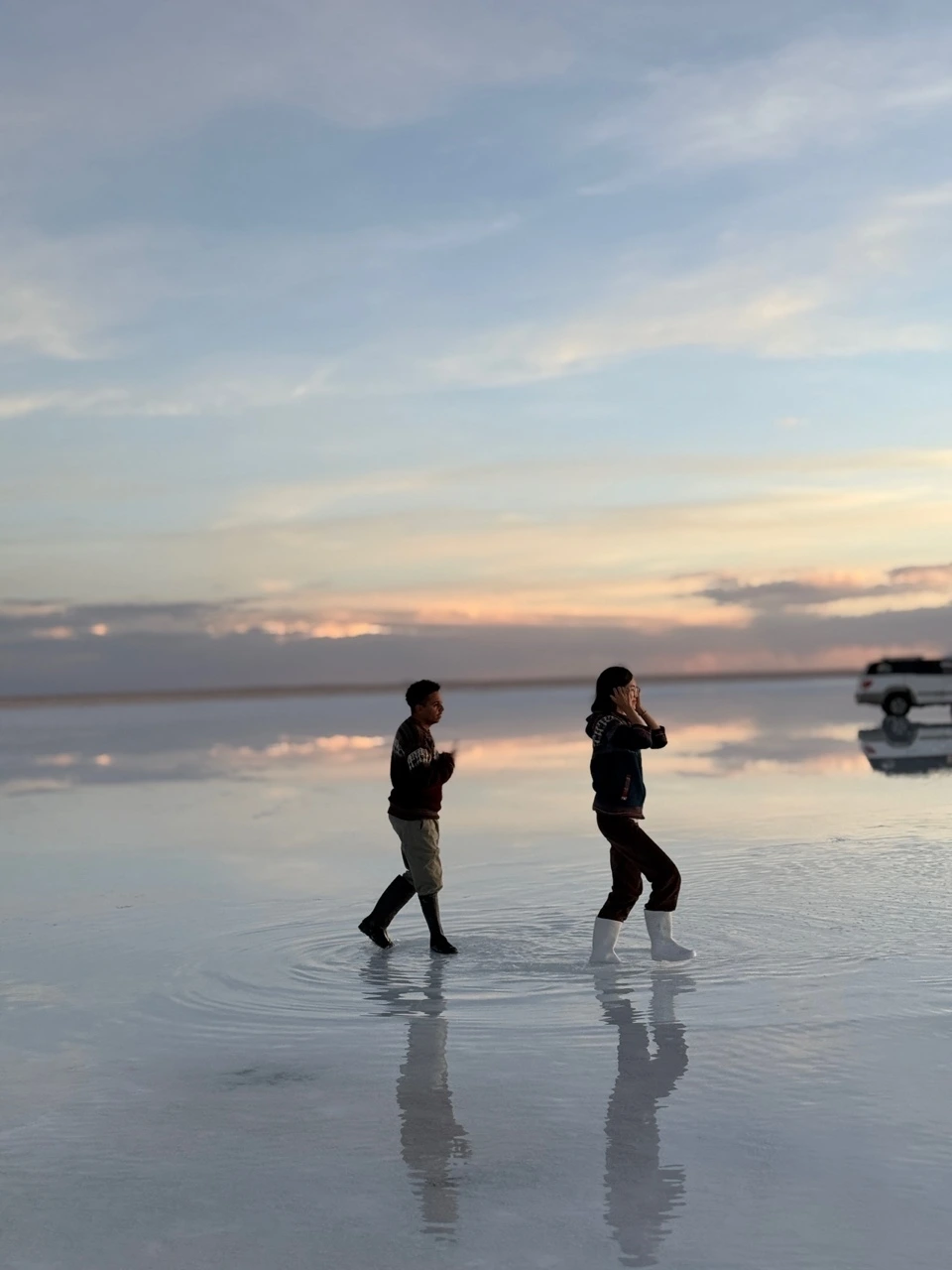 해가 질 시간에 맞추어서 마르케스는 우리를 다시 차에 태우고 이동했다. 우유니 소금사막이 지상 최대의 거울로 불리는 이유를 알 수 있는, 바로 물이 고여있는 곳으로 가고 있는 것이다.