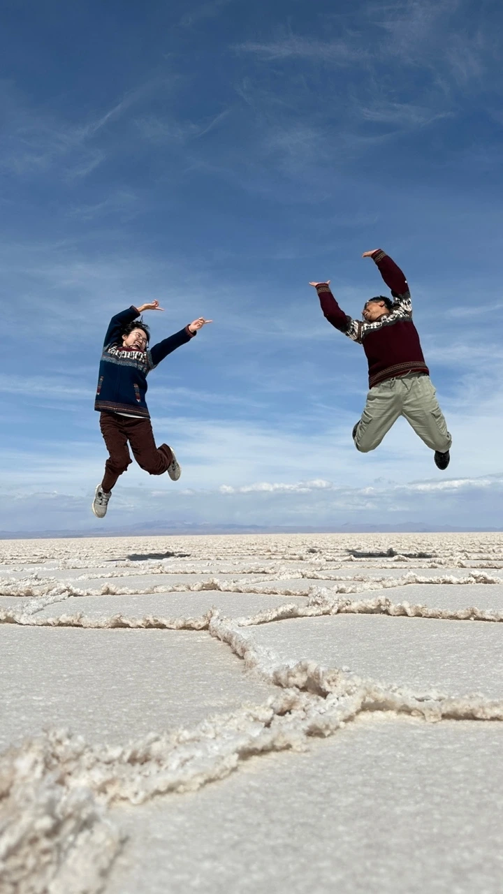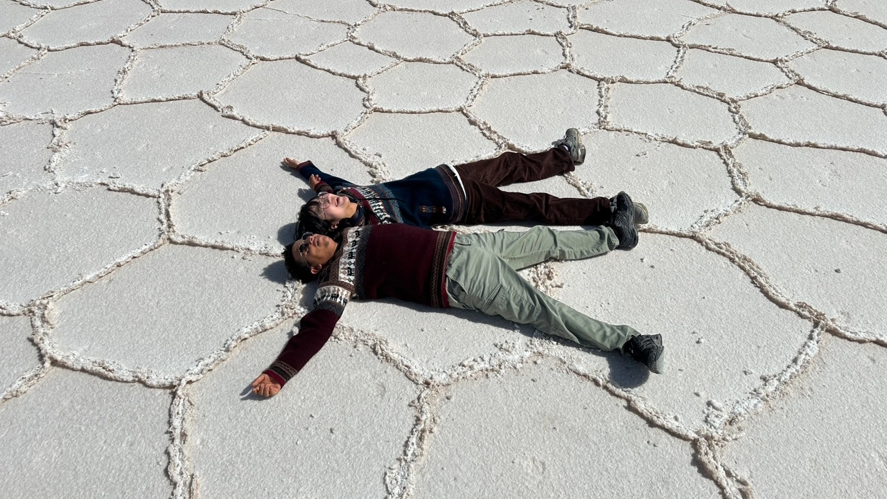 소금의 결정 모양이 선명하게 보이는 사막의 가운데에 다다라 차가 멈췄다. 차에서는 배가 무척 고팠는데 빛나는 소금 바닥에 내리자 생전 처음 마주하는 풍경에 배고픔도 깜박 잊을 정도였다. 이 전부가 소금이라니. 그 규모야 익히 들어 알고 있었지만 직접 만난 사막은 눈을 의심케 했다. 우리는 바닥의 소금을 찍어 먹어보기도 하고 그 위에 누워보기도 했다. 오랜 옛날, 한때는 바다였으나 지각변동으로 솟아올라 사막이 된 이곳. 지구에게는 그저 작은 꿈틀거림이었을 그 움직임이 만들어 낸 장소에 인간은 개미보다도 미미한 존재가 되어 그 위를 걸어다니며 경탄을 금치 못한다. 대자연 앞에 다시 한번 겸손해지게 되는 시간이었다.