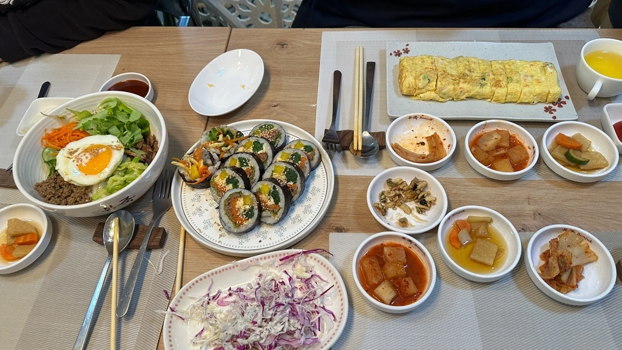 하루는 고맙게도 한국인 친구 S가 한식당에 우릴 초대해주었다. 비빔밥, 김밥, 닭강정, 콩국수, 떡볶이, 계란말이, 김치.. 한식이 너무나도 그리웠던 차에 한상 가득 차려진 밥상을 정말 정신 없이 먹었던 것 같다. 오랜만에 먹는 고국의 맛에 감격스럽기마저 했다. 깍두기 하나까지도 콧소리를 내면서 음미하며 먹었다. S의 배려 덕분에 밥심을 제대로 충전했던 날이었다.