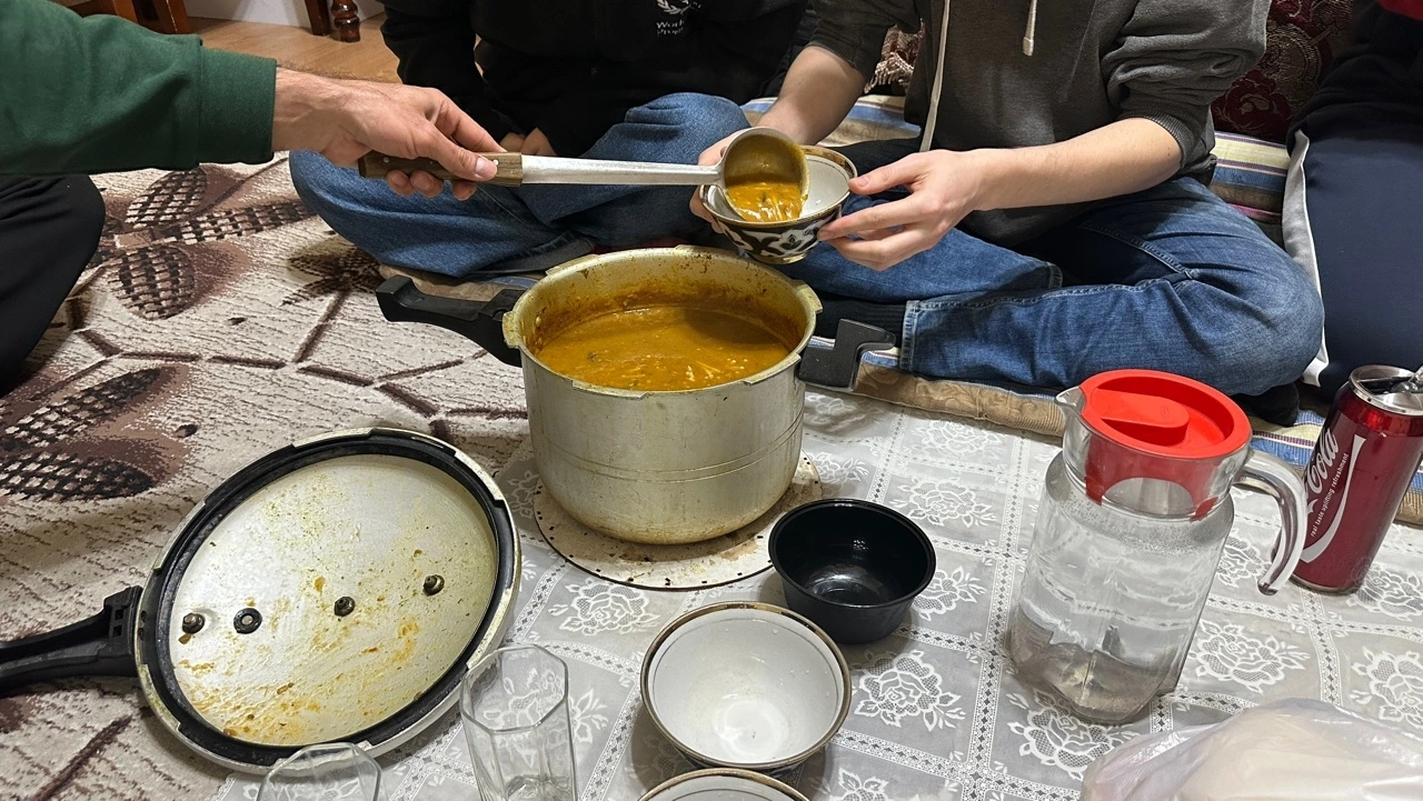 자말의 집에 모이는 다양한 국적의 사람들 중 드물게 타지키스탄 토박이 친구들도 있었다. 오늘은 타지키스탄인 친구 호쉬바트가 타지크 전통음식을 먹을 수 있는 음식점에 우리를 데려갔다. 우리는 '오쉬', '플라브'라고 불리는 중앙아시아식 요리를 시켰다. 고기와 야채와 함께 볶아낸 밥이었는데, 동아시아에서 먹던 볶음밥에 비하면 고기 기름에 코팅된 밥알이 반짝일 정도로 기름진 편이었다. 이 느끼함을 잡아줄 피클과 요거트를 밑반찬으로 같이 먹으면 질리지 않고 더욱 맛있게 오쉬와 플라브를 즐길 수 있다.