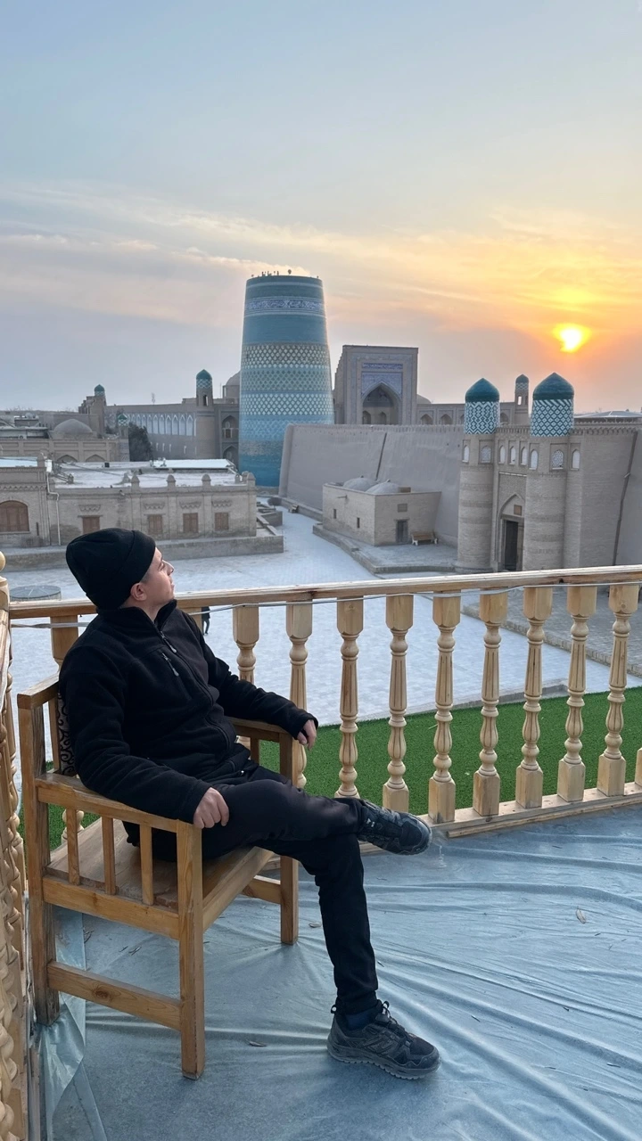 노을이 지는 이찬칼라를 둘이서만 보기 아까워, 몸살 기운이 있어 숙소에서 내내 쉬던 사디크를 어쩔 수 없이 깨워서 데리고 나왔다. 아프지만 않았으면 사디크가 오늘도 노래 한 가락을 불렀을 테지만 아쉽게도 목소리가 잘 나오지 않는다. 우린 어느 카페의 옥상에서 성벽 뒤로 넘어가는 해를 가만히 바라보았다. 곁에 있는 누군가에겐 애정을 더하고 멀리 있는 누군가에겐 그리움을 더하는 그런 풍경이었다. 척박한 사막의 한가운데에 핀 꽃같은 도시 히바에서의 하루도 그렇게 저물어갔다.