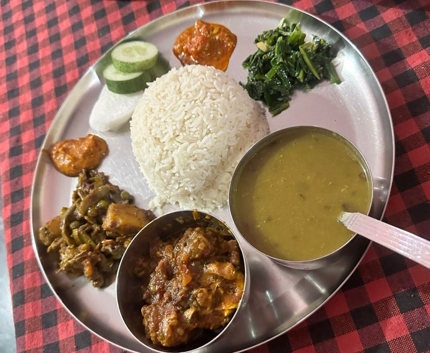 네팔의 기념품가게들을 둘러보면 "Dal bhat power 24 hour"라고 써진 티셔츠가 자주 보인다. 24시간 지속되는 달밧의 파워. '달밧'이란 네팔의 가정식으로 '달'은 콩으로 만든 소스를, '밧'은 밥을 뜻한다. 먹을 땐 밥에다가 소스를 붓고 조금씩 담아준 다른 반찬들을 기호에 따라 섞어 먹는다. 이 달밧은 한국에서 먹는 집밥을 떠오르게 했다. 소복이 쌓인 밥 한공기에 삼삼한 된장국물, 거기에 김치와 나물반찬을 곁들여 먹는 한상. 소박하지만 뱃속부터 맘속까지 든든해지는 엄마의 밥상과 비슷하다. 그렇기에 24시간을 버티는 힘이라는 말이 과장은 아니다.
