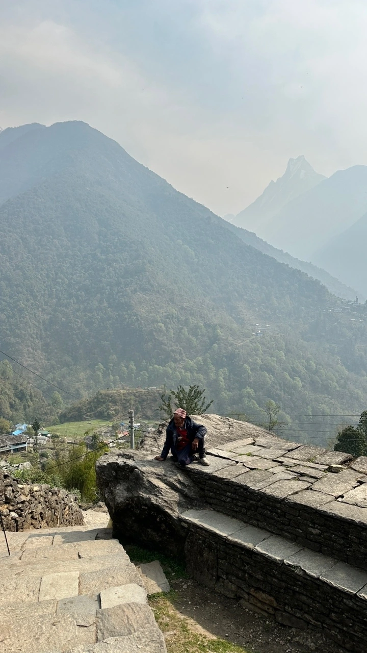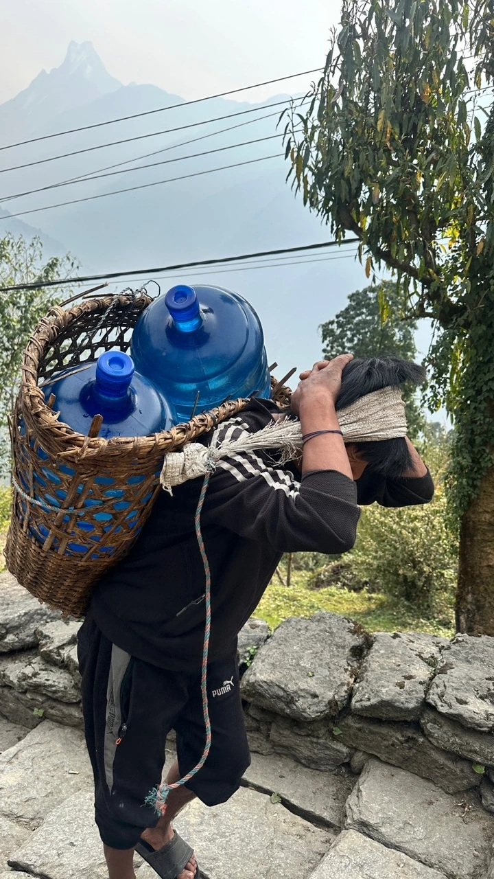 오늘도 어김없이 이마에 짐을 지고 오가는 포터분들을 마주친다. 모두가 등산객들의 짐만 나르는 것이 아니라 음식이나 생필품을 조달하는 분들도 많다. ABC에 가까워질수록 롯지의 숙박비용과 음식값 등 모든 것의 가격이 비싸지는 게 이 때문이다. 산 아래에서 윗동네까지 땀흘려 수십 kg의 물품을 날라주시는 분들의 인건비가 그에 다 들어간 것이다. 이를테면 포카라에서 한 접시에 200루피인 달밧은 해발 2000m 촘롱에선 400루피가 되고, ABC에선 800루피 안팎으로 뛴다.