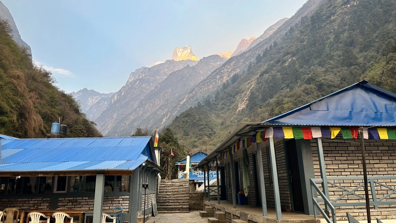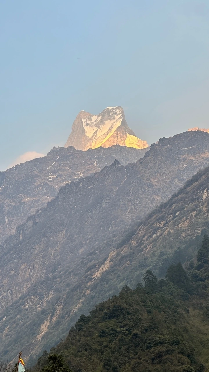 오늘도 무리하지 않고 해발 2000m의 촘롱에서 시작하여 2400m의 '도반' 이라는 마을까지만 올랐다. 고도 차이가 썩 크지 않은데도 날씨는 어제에 비해 두드러지게 추워졌다. 해가 질 무렵에는 낮에 산봉우리를 덮고 있던 구름이 걷히고 히말라야의 봉우리들 중 하나인 마차푸차레가 빼꼼 얼굴을 내밀었다. 그 광경을 보러 롯지의 숙박객들이 마당에 모여든다. 모두들 사그라드는 햇빛의 끝자락에 걸친 봉우리를 멍하니 바라보기도 하고 사진을 찍기도 한다. 우리도 내일이면 다시 계속될 ABC 로의 여정이 순탄하기를 바라며 봉우리에 시선을 머물렀다. 부디 굿럭이 있기를.