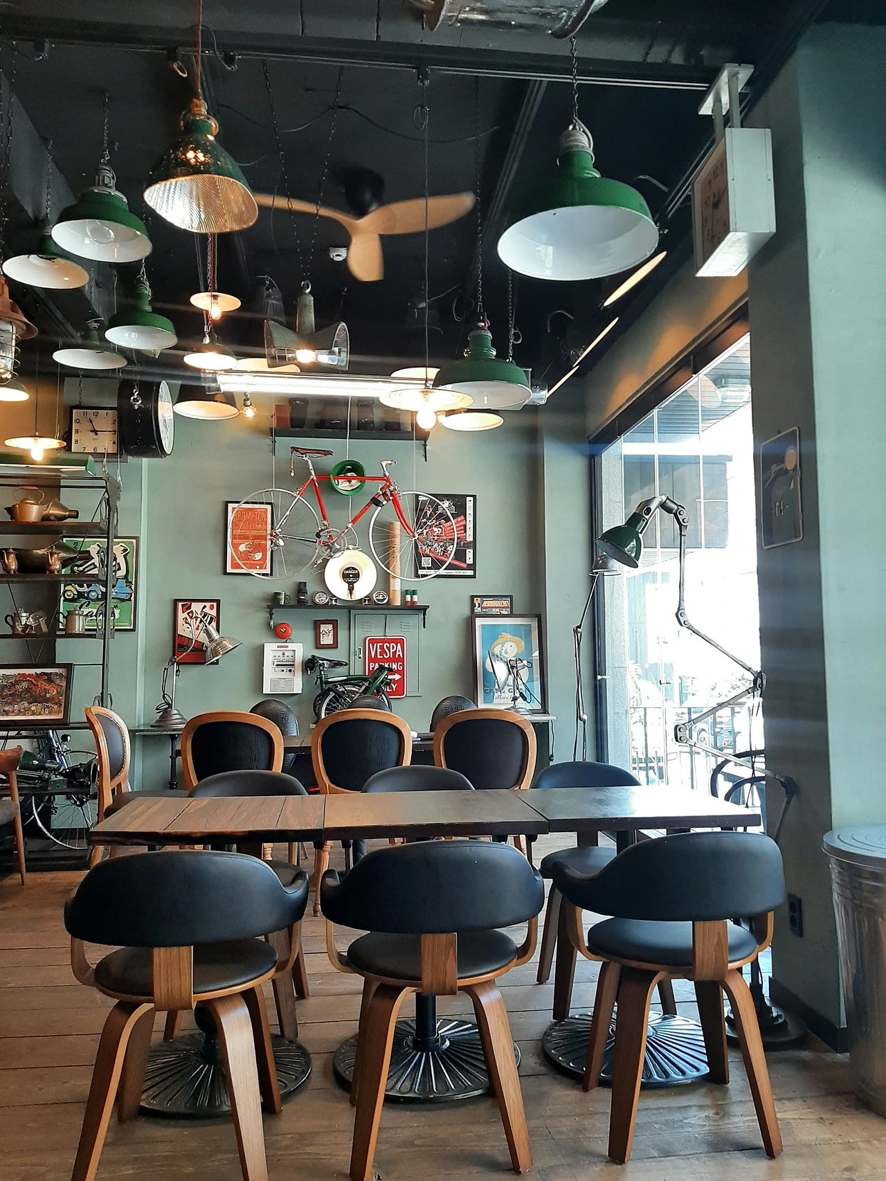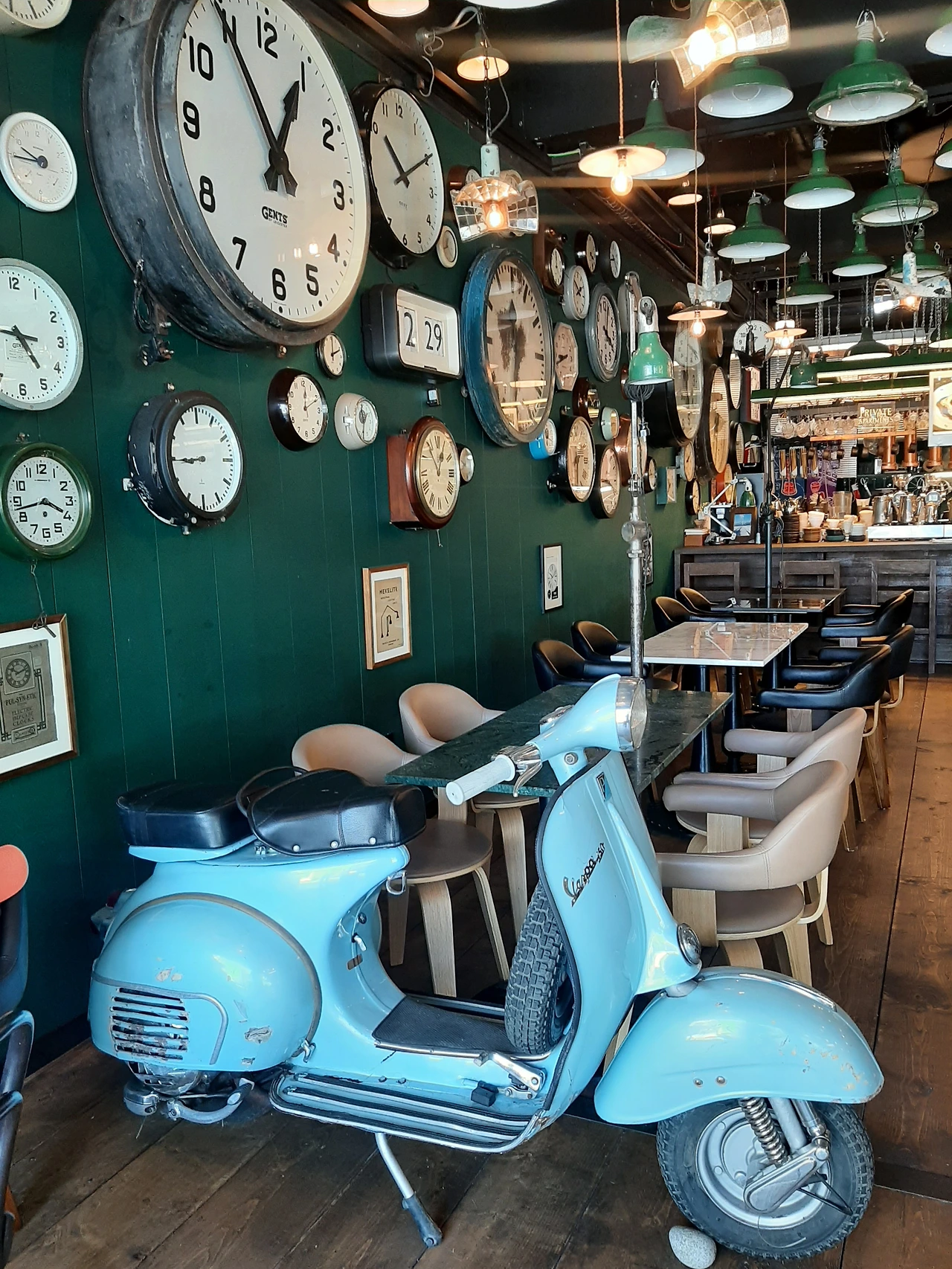 커피를 좋아하는 남편이 오면 데리고 갈 카페도 찾아 두었다. 다른 음료는 거의 없고 오로지 커피로 승부를 보는 집이다. 기계로 뽑은 커피도 핸드드립커피도 파는데, 원두를 원산지별로 다양하게 선택하여 마실 수 있다. 내부 인테리어까지 개성 있다. 오래되고 고풍스러운 물건들이 곳곳에 있어 신비로운 골동품 가게 같기도 하고, 벽면을 가득 채운 시계들을 보면 시계 수리점인가 착각도 든다. 산뜻한 하늘색의 옛날식 베스파가 시선을 끈다.