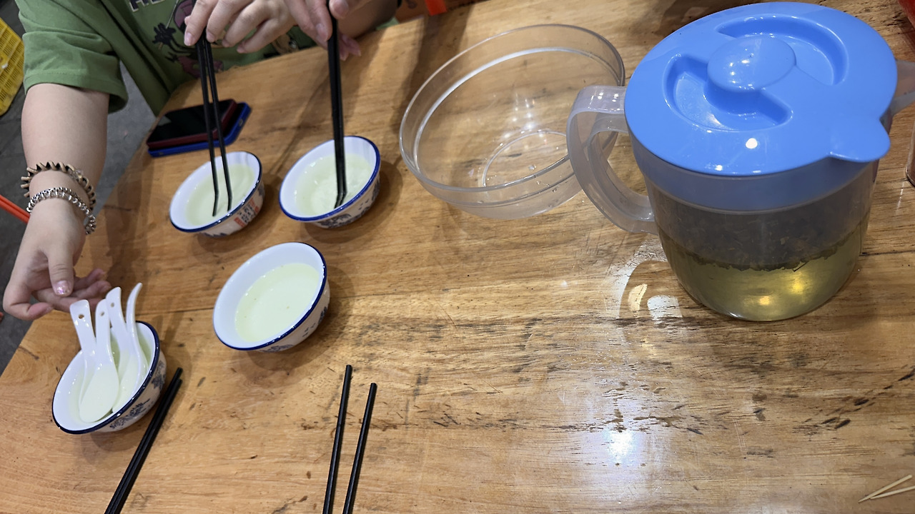 우리는 A와 Z가 하는 대로 따라 했다. 작은 꽃들이 떠 있는 찻물을 한잔 따라 젓가락과 숟가락을 씻은 다음 그 물은 옆에 있는 빈 그릇에 버린다. 그다음 빈 잔에는 새 차를 따라 마신다.