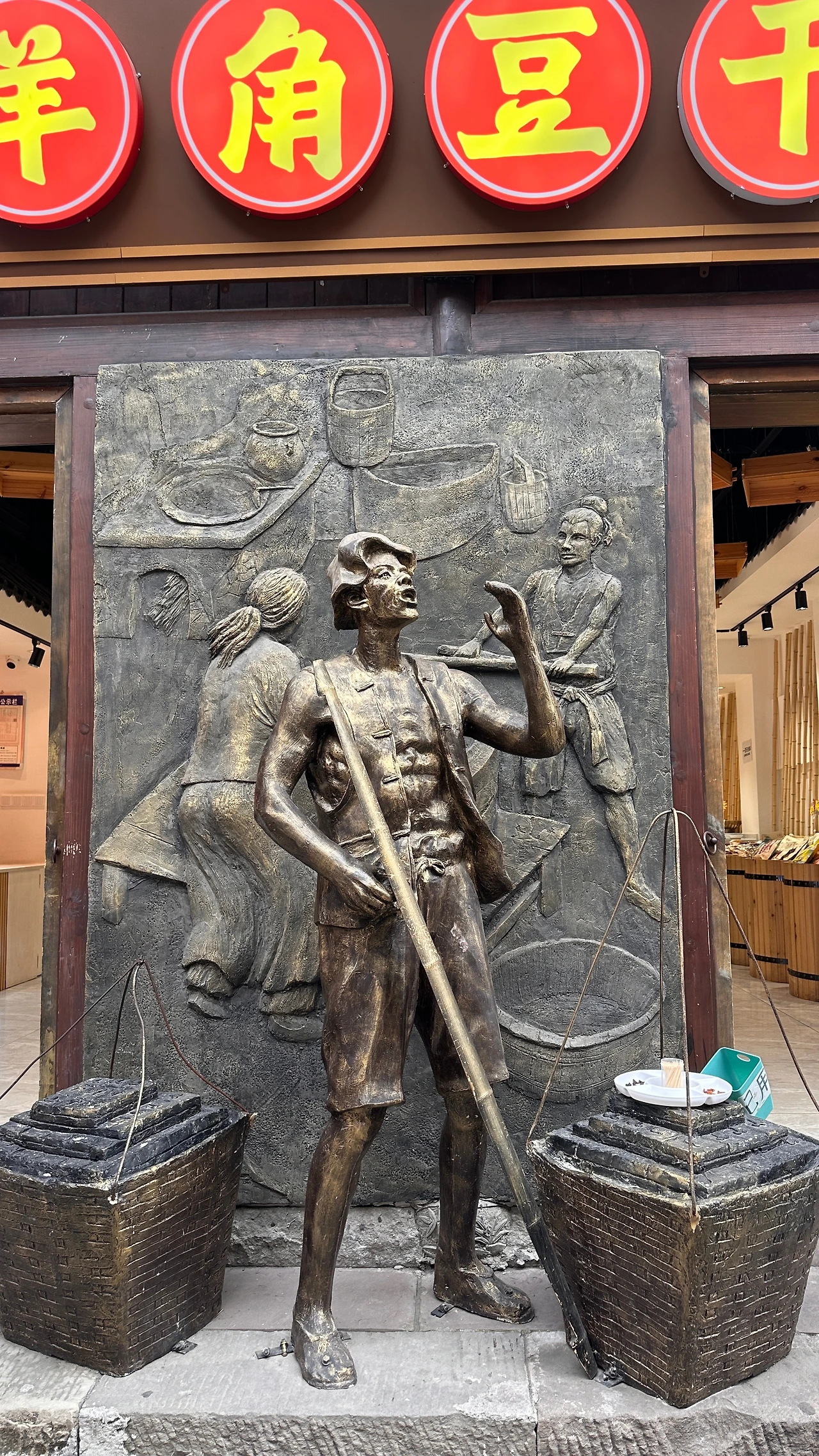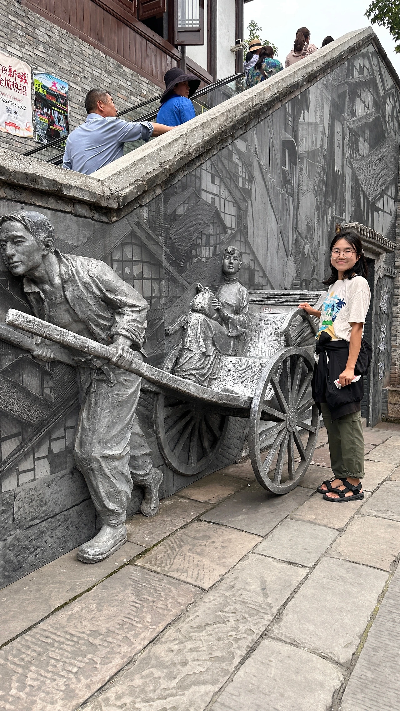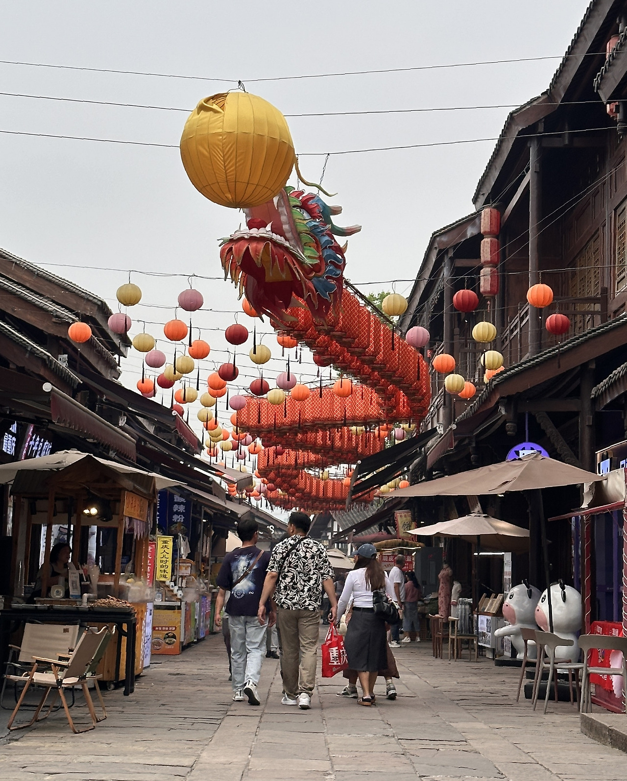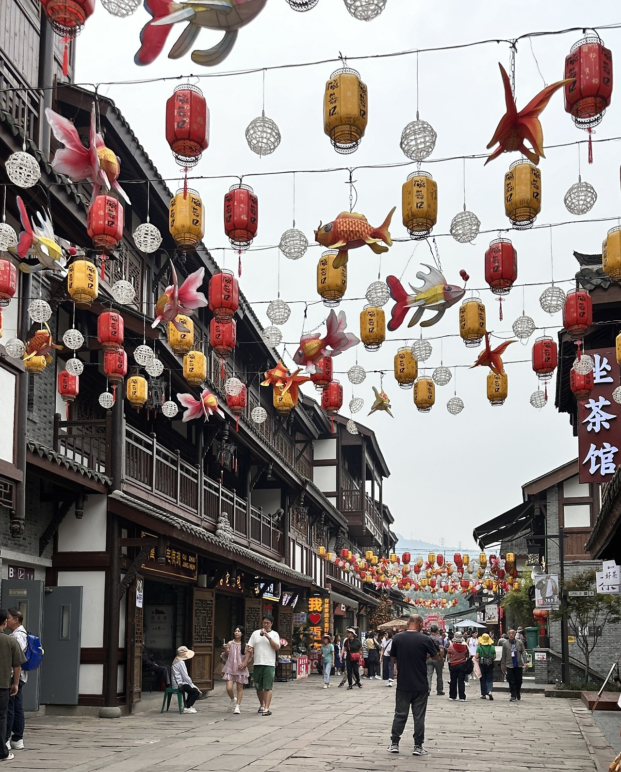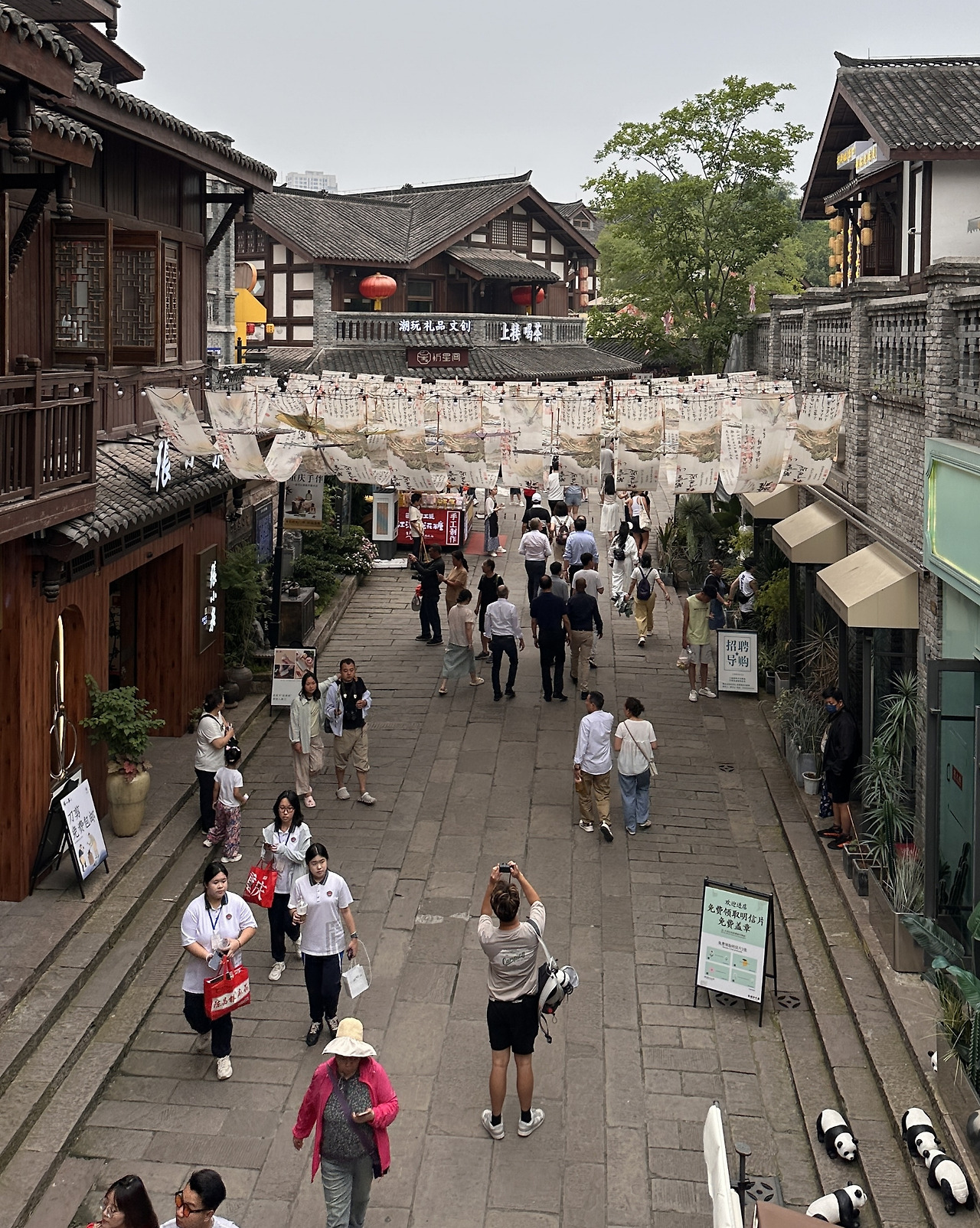 지하철 1호선을 타고 츠치커우 역에서 내리면 명청시대의 모습을 간직한 전통마을이 나온다. 우리나라의 한옥마을과 비슷하게 전통건물에 현대식 상점들이 입점해있다. 같은 동아시아이지만 중국의 건축물은 우리나라의 건축물과 상이한 부분이 많았다. 석재보다는 목재를 위주로 사용하고, 석재라도 큼직하게 깎아 쌓은 돌보다는 작은 벽돌로 지은 집이 많으며, 단층보다 중층의 건물이 대부분이다. 지붕의 모양이 부드러운 곡선을 이루며 끝이 버선코처럼 하늘로 휘어지는 한옥과 다르게 중국의 지붕은 직선에 가깝다. 기와의 크기와 모양도 달랐는데 두텁고 큼직한 골을 만들어내며 검푸른빛을 띠는 우리기와와 달리 중국의 것은 크기가 조금 작은 듯 보이고 촘촘하게 배치되었으며 짙은 회색빛을 띠었다. 건물들 사이를 가로질러 꾸며진 장식들은 붉은 계열로 강렬한 인상을 주고, 물고기나 용과 같이 동물의 모양이 다양한 다수의 등을 사용하여 다채롭고 화려하다. 은은한 빛을 내는 청사초롱을 달아 단아하고 차분하게 꾸민 우리 한옥마을과의 또 한가지 차이점이다.
